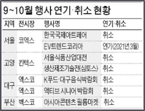 코로나로 인해 비대면 활성화가 되면서 사람들이 많이 모이게 되는 박람회가 취소되거나 꺼리는 비중이 증가했다. 한국전시주최자협회에 따르면 올 8월까지 전시업계 매출은 90% 가까이 급감하면서 직접 피해만 최소 100억 원이 넘는다고 했다. 올 1~8월 예정됐던 전시회 362건 중 70%가 넘는 254건이 취소됐다.