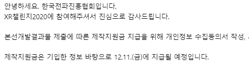 그리고 진짜 마지막으로 한국전파진흥협회 XR챌린지2020 관련 대상과 뉴스가 궁금하다면 : www.datanet.co.kr/news/articleView.html?idxno=153769