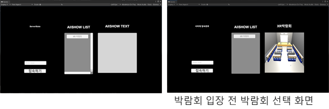 1. 각 부서별 상담자와 관람객의 멀티 구현 : Photon Unity Networking(PUN) 을 통해 멀티플레이를 구현했다. 만약 여러 명이 접속한다면 서로 볼 수 있으며 서로 행동, 대화를 통해 상호작용할 수 있다. 참가자는 참여하고 싶은 박람회를 골라 누를 시 해당 박람회 정보를 확인할 수 있다. 박람회에 접속하기 전에 특정 패스워드 입력 시 매니저로 분류되며, 그 외에는 일반 참가자로 박람회에 입장하게 된다.