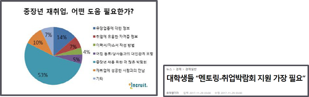 기사에 따르면 대학생들이 멘토링과 취업박람회가 많은 도움이 되었다고 응답을 하였으며 또한, 취업포털 인크루트(대표 이광석)가 자사에서 설문 조사한 결과에 따르면 취업포털 응답자의 53%가 “재취업의 실질적 도움으로 채용 박람회가 더 열렸으면 좋겠다.”라고 답하였다. 이렇듯 채용/대학 박람회의 필요성이 증대되고 가운데,