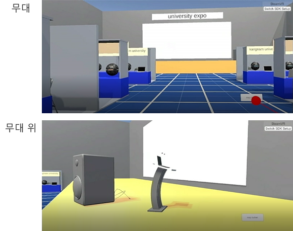 1. 소개나 발표를 할 수 있는 무대 : 실제 오프라인 박람회를 가게 되면 시작 전 오픈 소개를 하거나 운영하는 중간에 이벤트나 강의 관련 발표를 하는 공간이 있다. 이러한 부분을 반영하여 소개나 발표할 수 있는 무대를 재현하였고 꼭 발표를 하지 않아도 박람회 관련 영상을 틀 수 있는 창을 만들어 놓았다. 이를 통해서 부스 참여 문의를 받을 때 부스 문의 뿐만 아니라 특정 박람회가 여는 중에 관련 발표나 소개 문의를 받아서 진행할 수 있도록 하고자 한다.