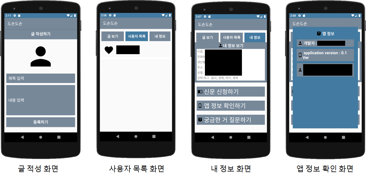 사용자 목록을 통해 누가 이용하고 있는지 알 수 있으며 내 정보 화면을 통해 내 정보가 입력한 정보를 볼 수 있다. 신문 신청하기 버튼을 누르면 신청되었다는 알림을 주며 앱 정보 확인 정보를 통해 앱에 대한 정보를 확인할 수 있습니다.