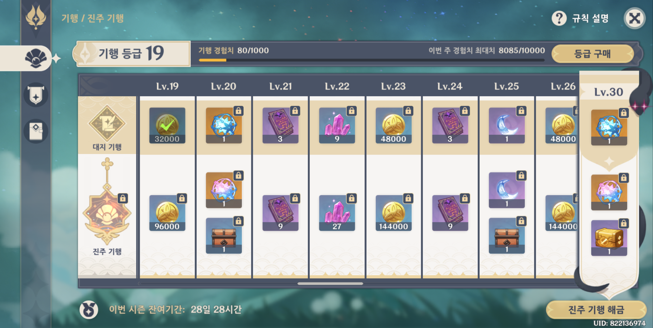 원신 내에서는 매일매일 하는 일일퀘스트 4개가 있으며 위에 보시다싶이 특정 기간동안 포인트를 쌓아서 보상을 얻는 기행이라는 것이 존재합니다. 덕분에 이것저것 너무 할 게 많습니다.