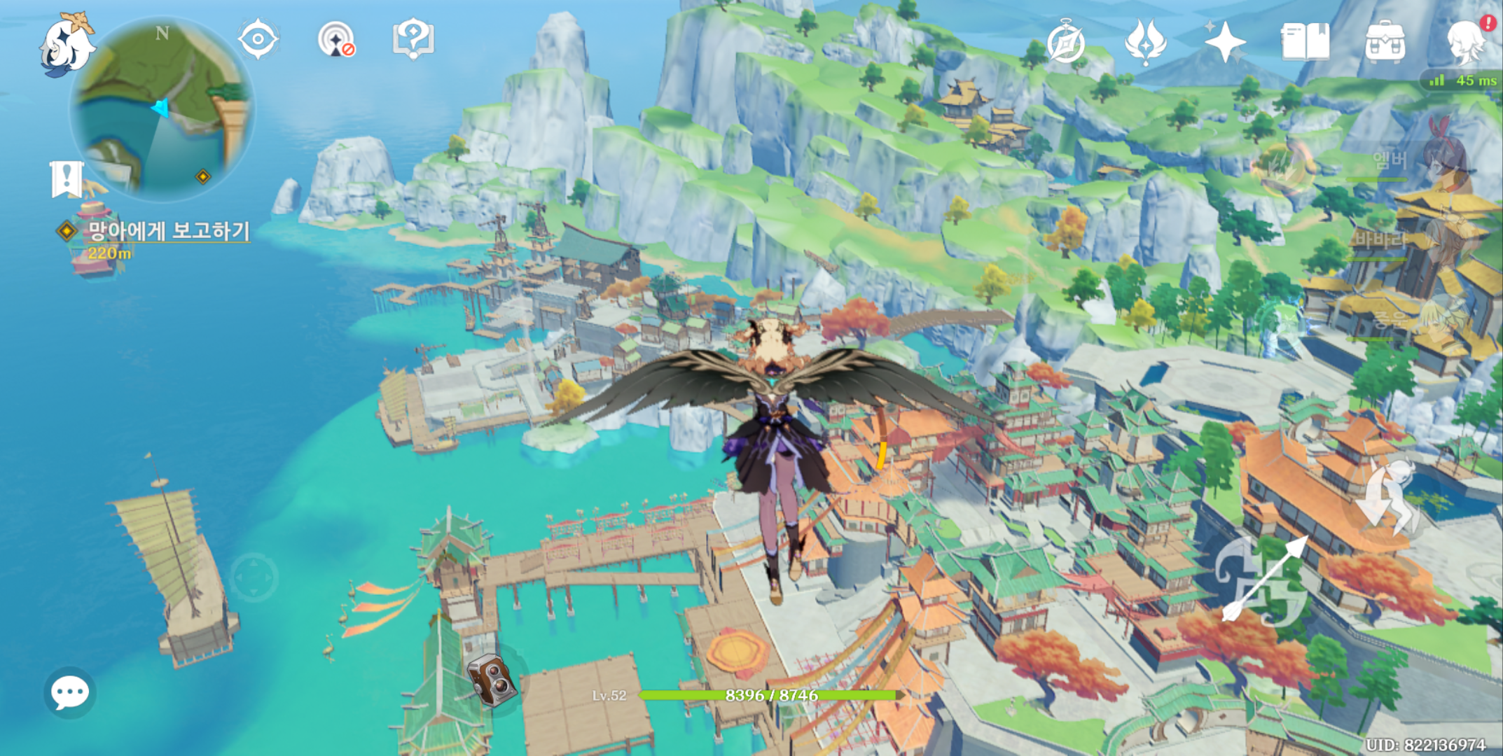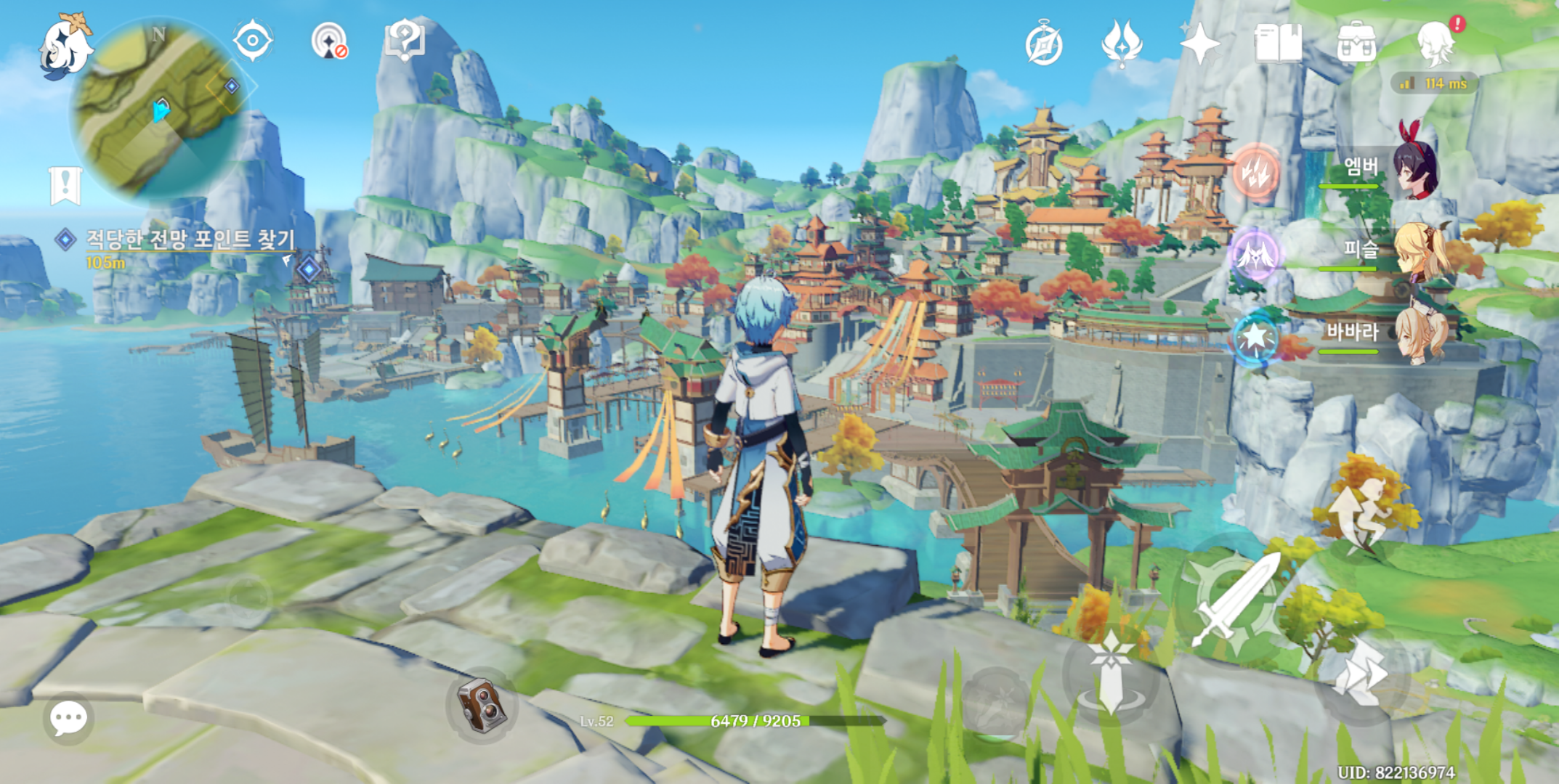 보통의 RPG 게임에서는 걷고, 뛰고 같은 모션이 주인 방면에 원신 경우는 날고, 산을 오르고, 걷고, 뛰고 등등 다양한 자유도 높은 모션을 할 수 있습니다. 그때문에 산 꼭대기로 올라 산을 정복할 수 있습니다.