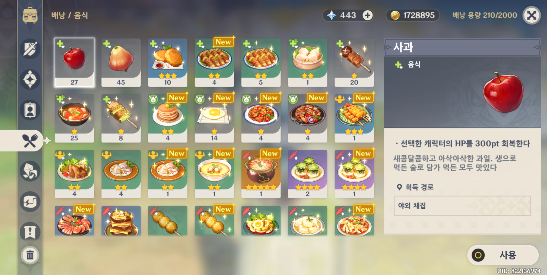 위에서 얻은 채집물은 단순히 팔거나 퀘스트에만 사용되지 않고 이렇게 요리를 만드는데 적극적으로 활용이 됩니다. 위에 보시다싶이 다양한 요리 레시피들이 있으며 각 음식을 만들어서 캐릭터에게 회복을 시키거나 부활 시키거나 버프를 거는데 사용할 수 있습니다.