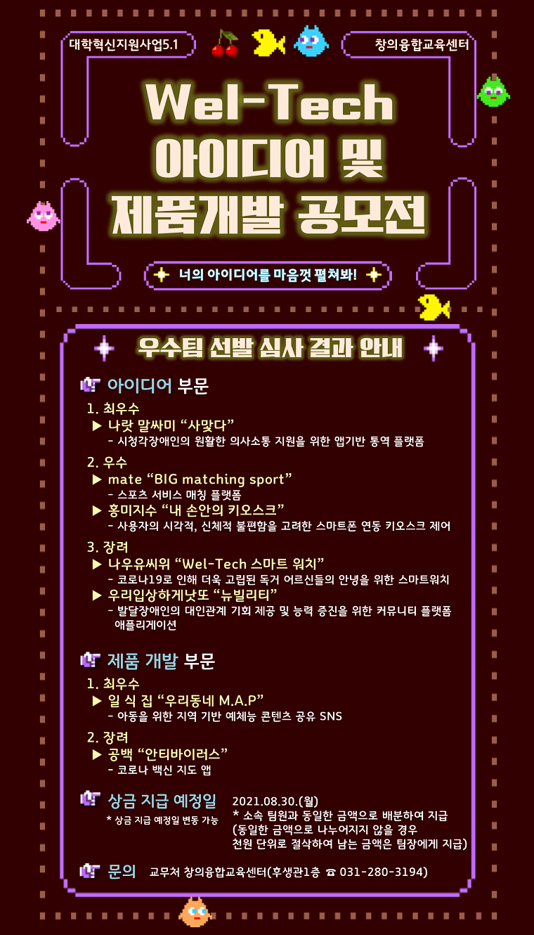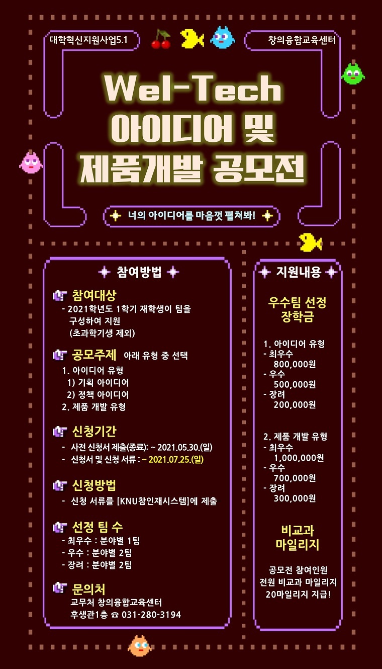 참여한 공모전 이름은 "2021 Wel-Tech 아이디어 및 제품개발 공모전"으로 아래 공모전 포스터를 참고할 수 있습니다.