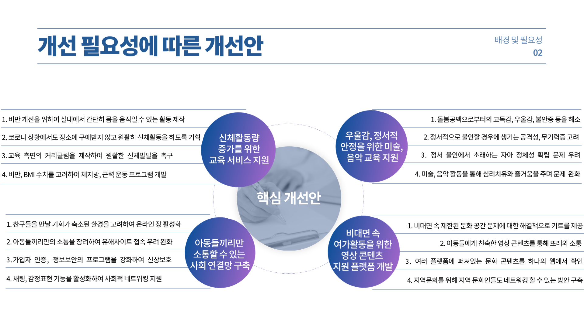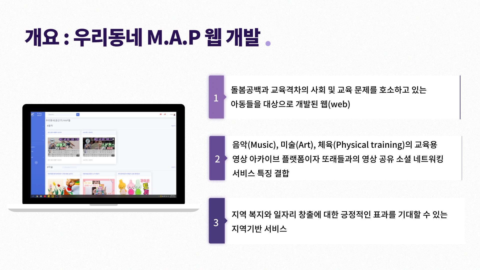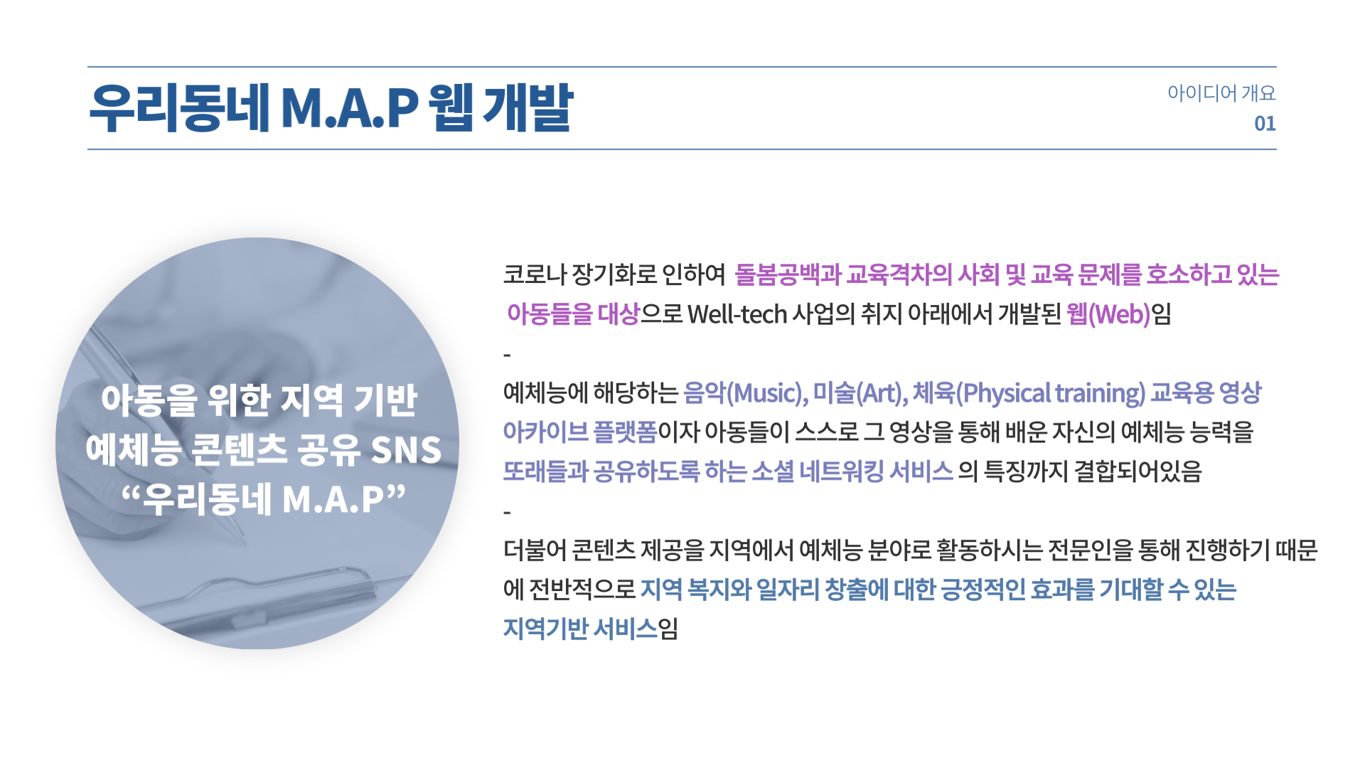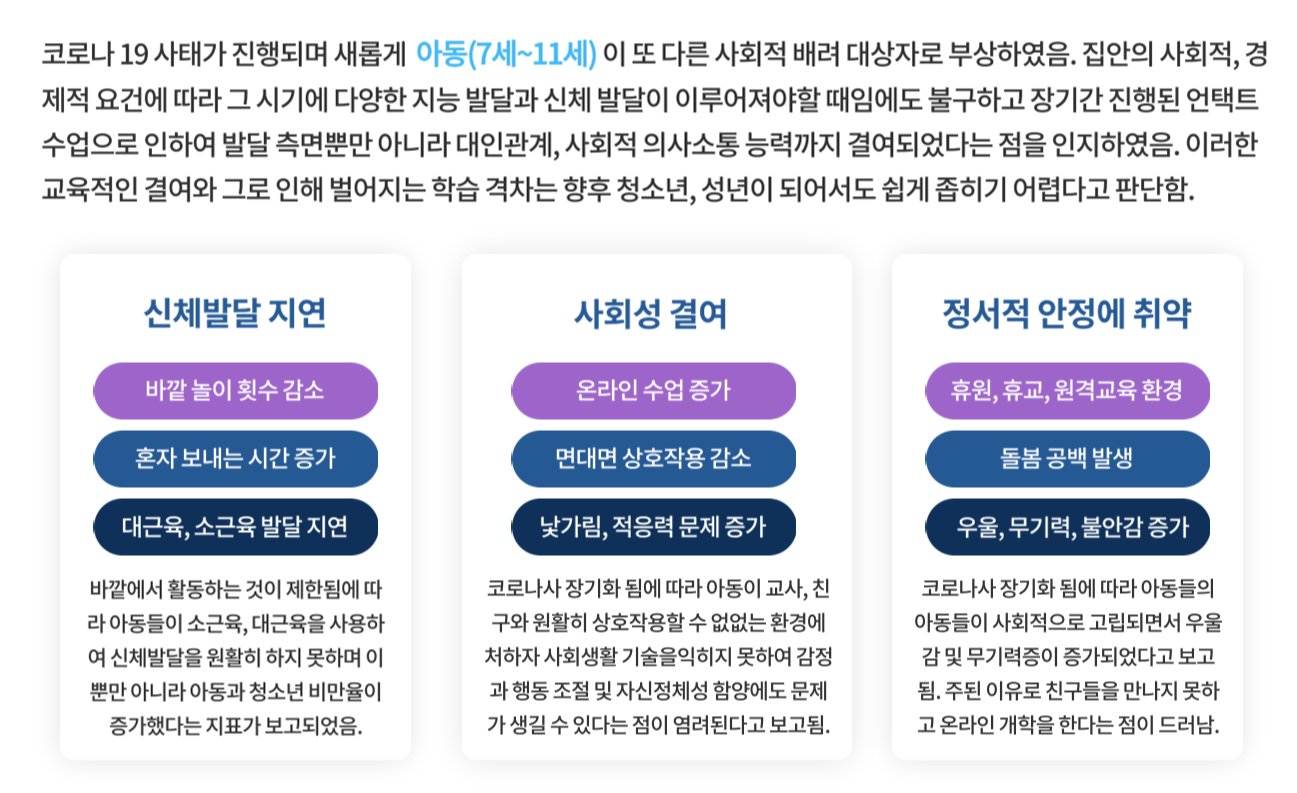저희 아이디어가 나오게 된 계기는 일단 wel-tech을 하면 노인 관련된 아이디어들이 많이 나오는데 이번 공모전에서 코로나 wel-tech 이기 때문에 일반 취약계층과 코로나 시대에 취약계층은 같지 않다는 것에서 출발해서 코로나 시대 취약계층인 아동이라는 주제가 대두되게 되었습니다. 또한 교육학과의 지식을 활용해서 아동의 교육 문제점이 찾게 되었습니다.