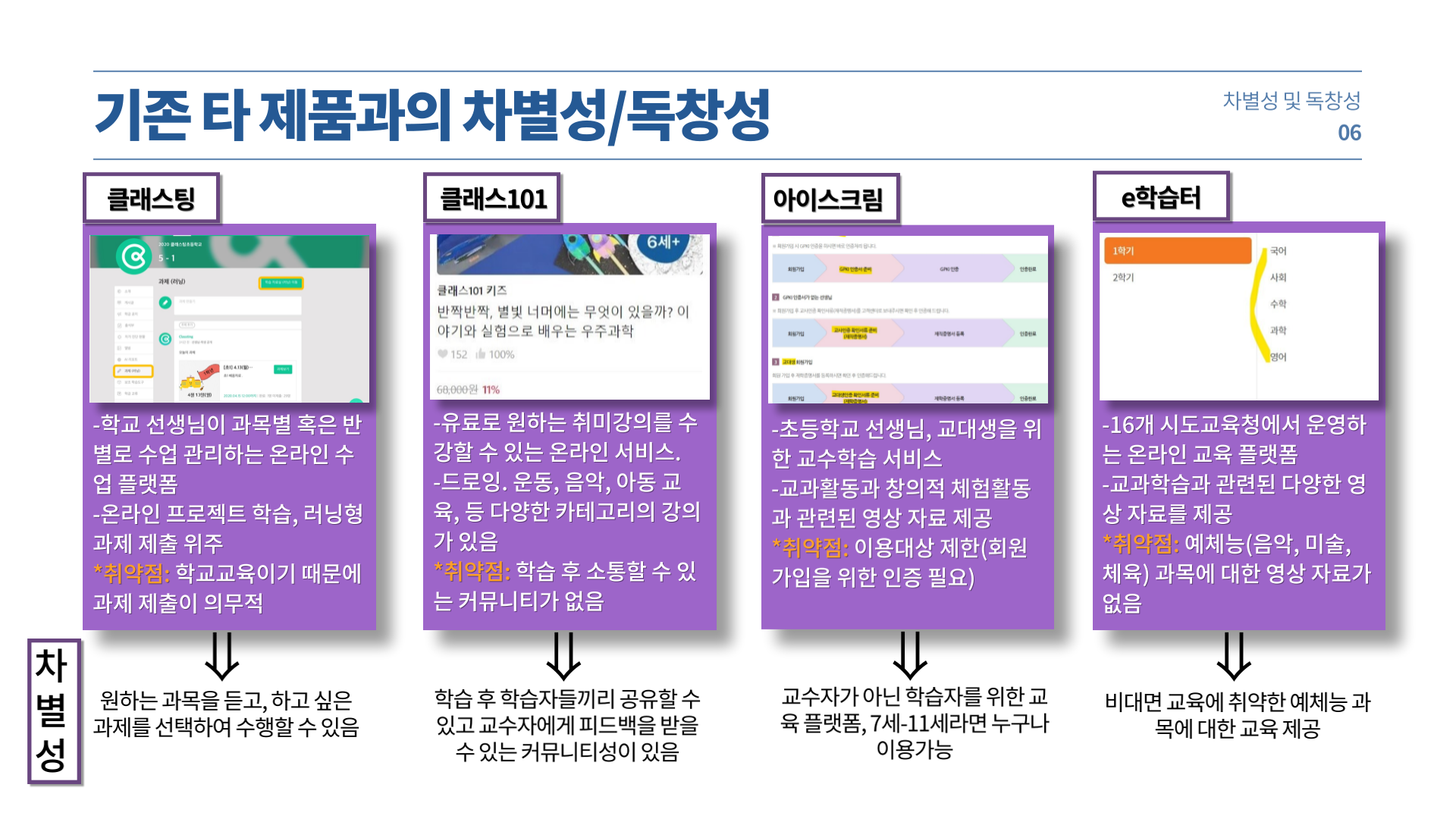 아래는 저희 제품과 유사한 제품들을 찾아 비교한 차별점입니다.