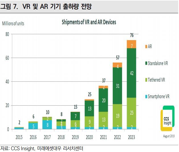 2. VR 및 AR 기기 출하량은 2021년 3700만 대에서 2023년에는 약 2배인 7600만 대까지 판매 예상