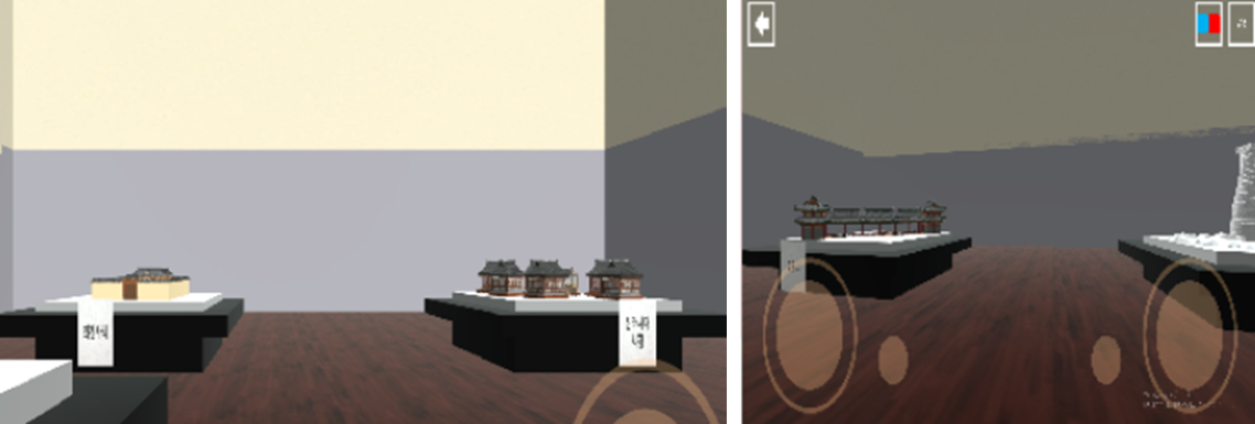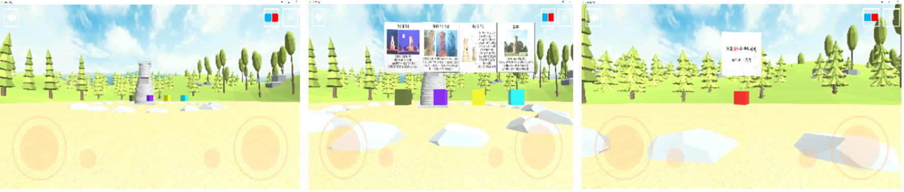 첨성대의 모델링을 구경할 수 있으며, 앞에 상자 오브젝트가 있는데, 그 오브젝트를 클릭하면 첨성대에 대한 설명인 내부 및 구조와 관련 일화, 현재 야경의 경치 등에 대한 정보를 UI를 통해 전달한다. 마지막 빨간색 상자 오브젝트를 누르면 처음 로비 장면으로 이동하게 된다.