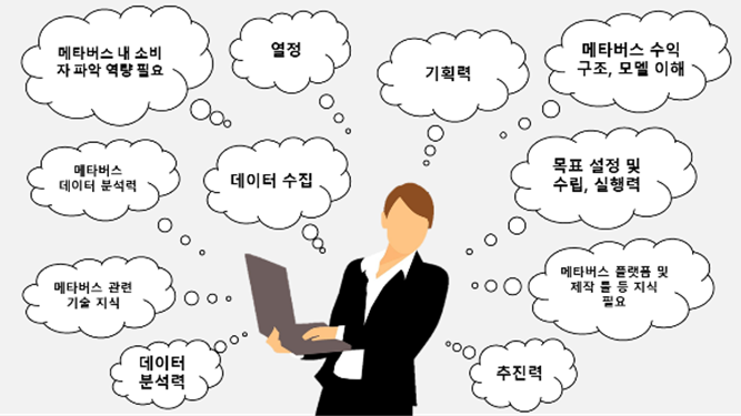 메타버스 데이터 마케터는 클라이언트의 니즈를 파악하기 위한 기본적인 마케터로서의 역량을 가지고 있어야 하며 융・복합 형태로 진화하는 메타버스에 맞춰 다양한 지식이 요구된다. 메타버스 플랫폼 각각의 특성을 이해하고 마케팅 목적에 맞게 선정하여 마케팅계획을 수립해야 한다. 이에 따라 메타버스 관련된 지식에 대한 이해 및 콘텐츠 기획 능력이 필요하다. 콘텐츠를 기획하기 위해 메타버스 관련 기술에 관한 이해가 필요하다. 또한, 메타버스 내 데이터 분석 및 활용을 위해 데이터 관련 지식 대한 이해도 필요하다. 메타버스 데이터 마케팅 분야에 진출하여 능력을 발휘하려면 메타버스에 대해 지속적인 조사 및 분석이 가능한 끈기가 필요하며 광고 콘텐츠를 기획하기 위한 창의성과 글로벌적인 넓은 시야도 필요하다.