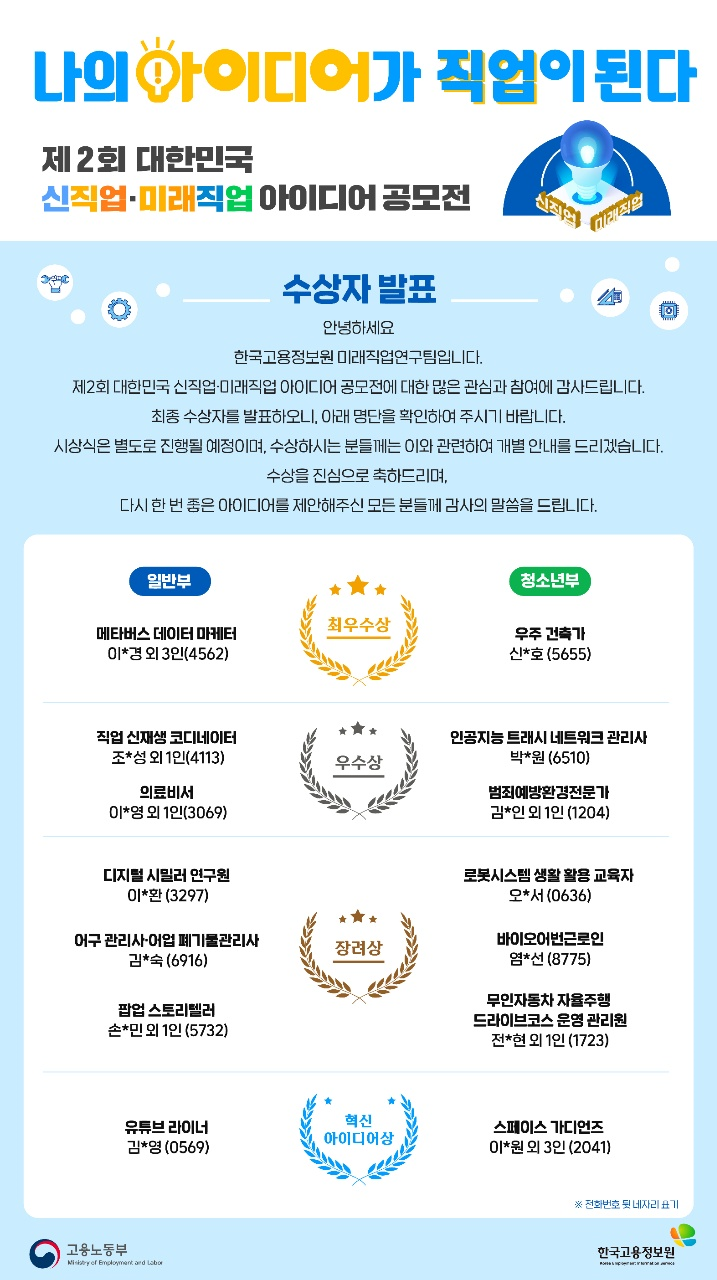 안녕하세요 이번에 참여한 공모전 이름은 "제2회 대한민국 신직업·미래직업 아이디어 공모전"으로 한국고용정보원에서 주최하였고 아래 공모전 포스터를 참고할 수 있습니다.