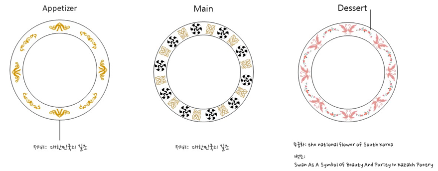 대한민국의 길조인 제비 문양, 대한민국의 대표 꽃 무궁화, 카자흐스탄 아름다움을 나타내는 백조 등의 문양을 섞어서 코스 요리에 맞게 각 에피타이저, 메인, 디저트 순으로 그릇의 문양을 제작함.