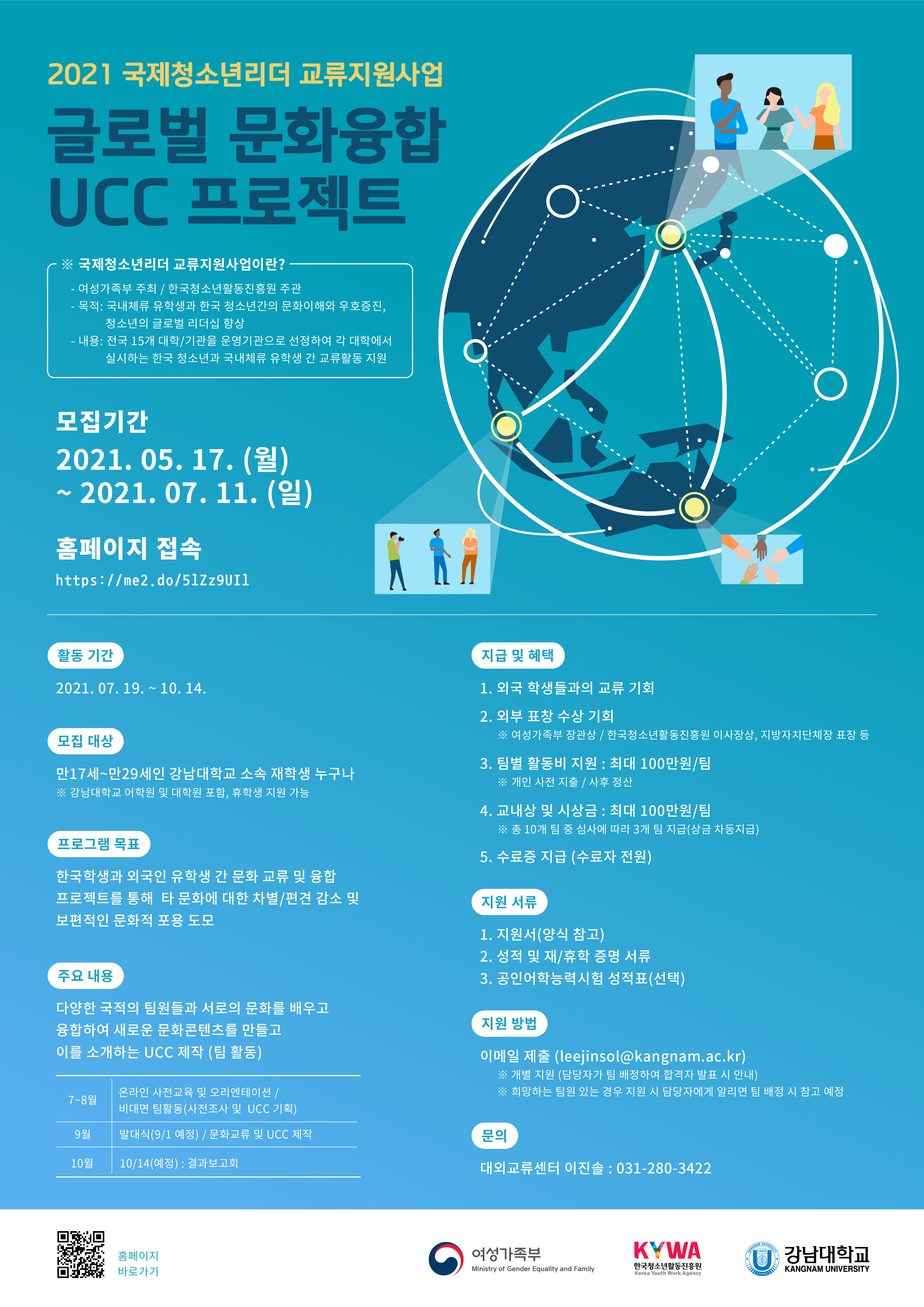 안녕하세요 이번에 정리하는 내용은 글로벌 프로젝트로 학교 유학생들과 팀을 이루어서 문화융합에 대한 UCC를 제작하는 약 2~3개월 활동하는 프로그램이자 공모전입니다. 참여한 프로젝트/공모전 이름은 "글로벌문화융합 UCC 프로젝트"로 아래 공모전 포스터를 참고할 수 있습니다.