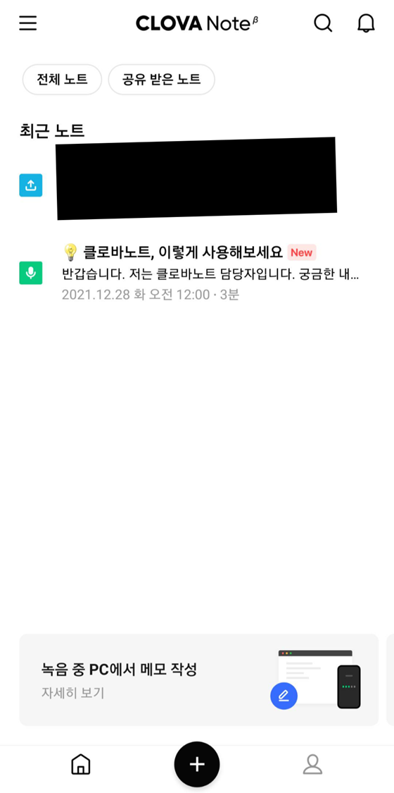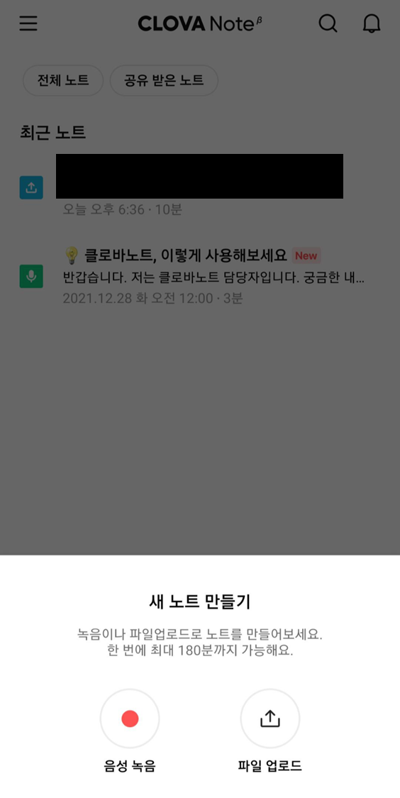 위 화면은 처음 화면으로 이때까지 기록된 내용이 남아있습니다. 새로운 음성 파일을 텍스트로 바꾸기 위해서는 아래 + 모양의 버튼을 눌려줍니다. 그 후 새 노트 만들기가 뜨면 음성녹음을 눌려 바로 녹음을 하면서 기록하거나 파일 업로드를 통해서 텍스트로 변화해줍니다.