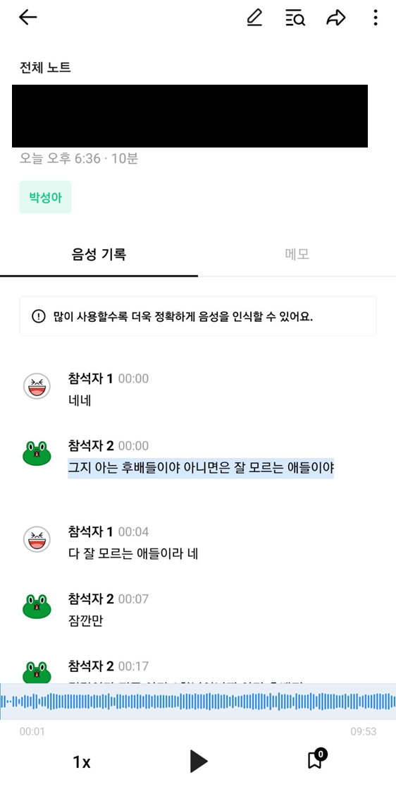 저같은 경우 전화 음성 파일을 업로드 했습니다. 통화 녹음 경우 기본적으로 2명의 대화자가 있다고 판단해 해석해줍니다. 아래 화면을 보시다싶이 참석자 1, 2로 나눠지며 비교적 해석이 잘된 것을 볼 수 있었습니다. , 일부 텍스트를 누르면 해당 부분의 녹화만 다시 들을 수 있는 기능도 있습니다. 어려운 용어 등 잘 해석되지 않은 부분만 직접 듣고 판단하기 좋은 거 같습니다.