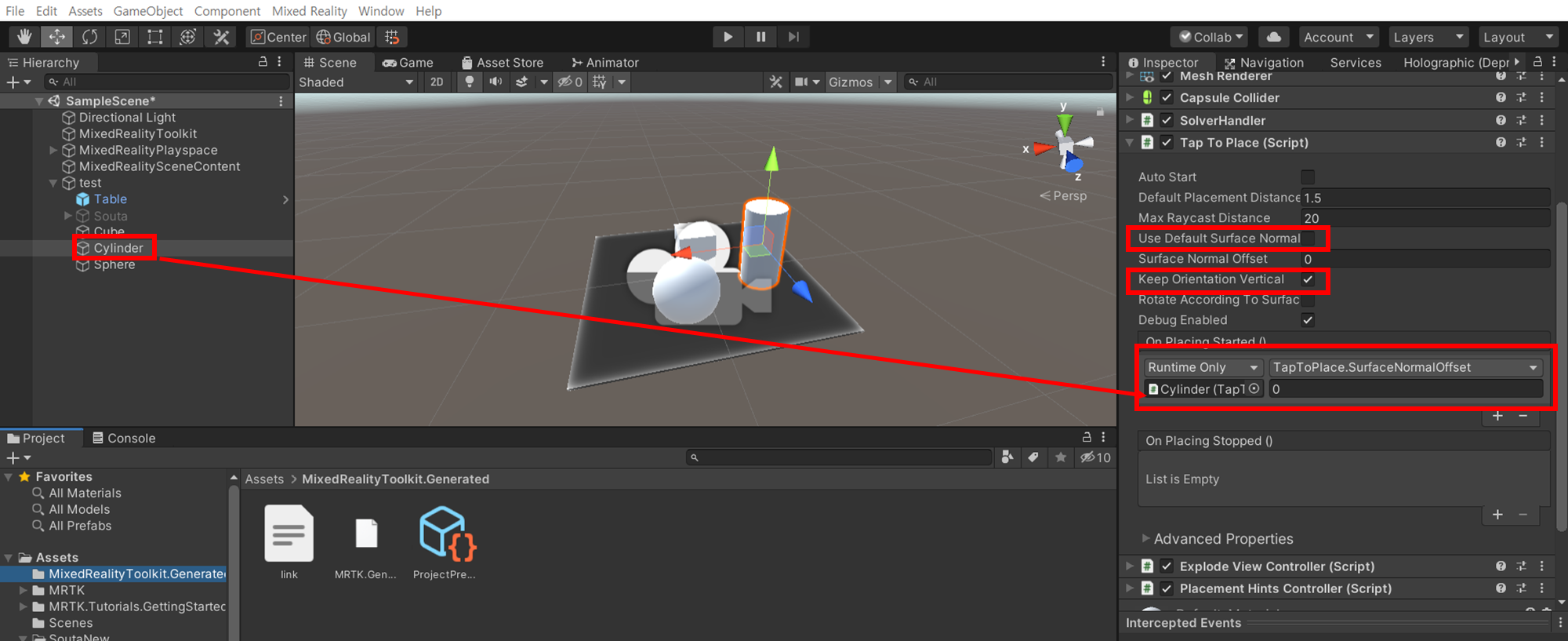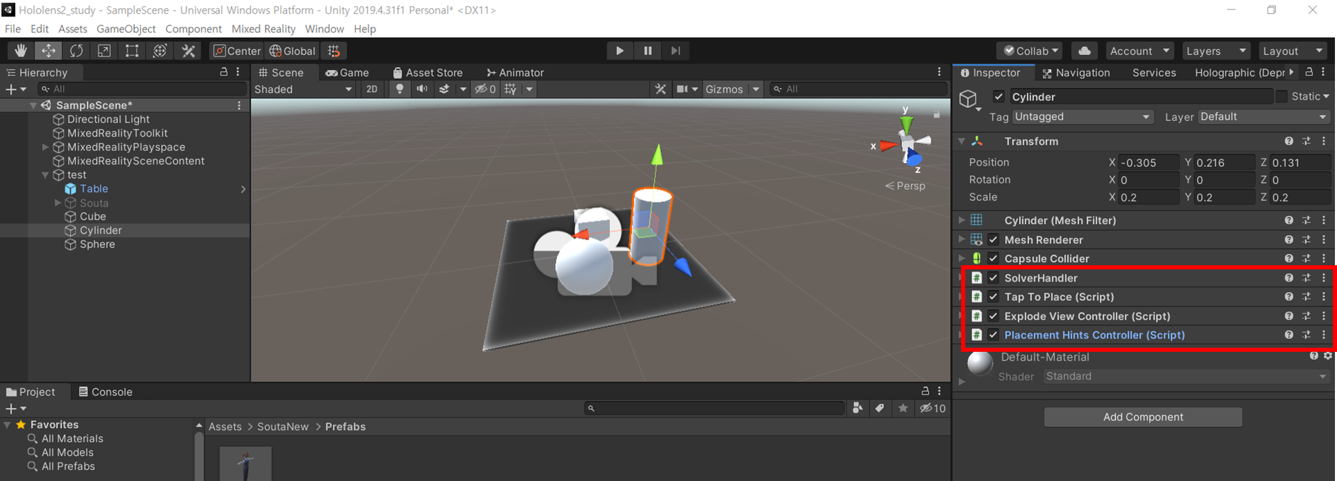 4. 상호작용하고 싶은 객체에 그림과 같이 SolverHandler / Tap To Place / Explode View Controller / Placement Hints Controller 스크립트를 추가해줍니다.