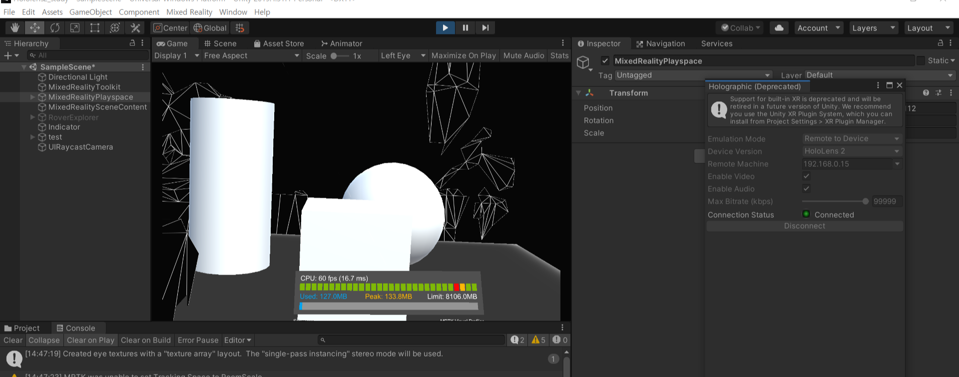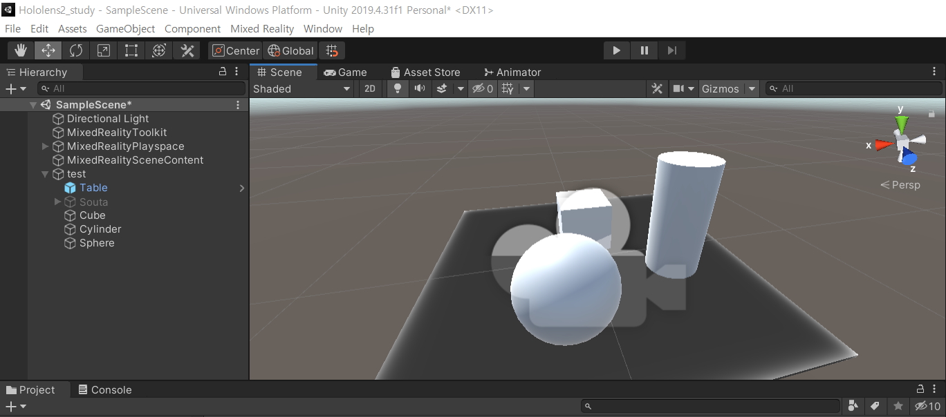 3. scene에서 3d 오브젝트를 MixedRealityPlayspace 에 따른 카메라 기준으로 배치해주었습니다.