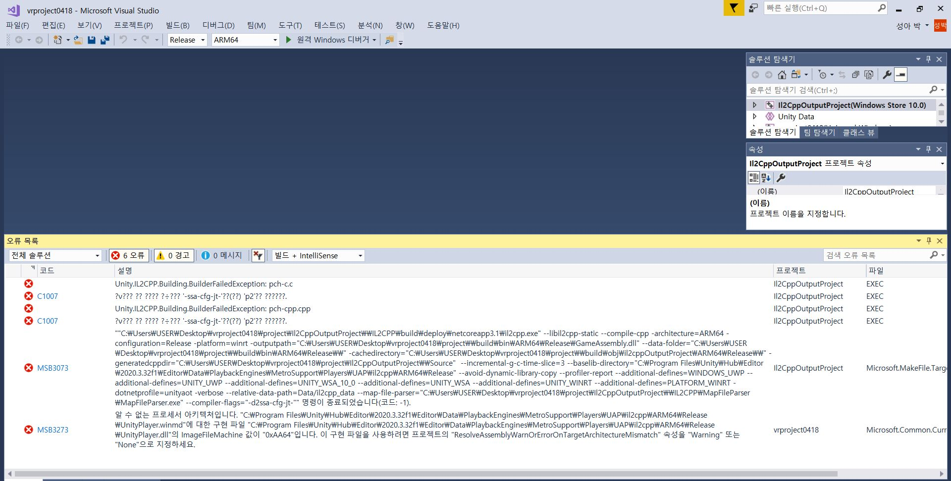 il2cppoutputproject 오류가 나서 한동안 헤맸는데 해결해서 해결방안 적어놓습니다. 다른 분들도 저처럼 긴 시간 안 헤맸으면 좋겠네요. 저 같은 경우 비주얼 스튜디오를 원래 2017 쓰고 있었는데 이 비주얼 스튜디오를 2020으로 바꾸는 오류가 사라지고 빌드할 수 있었습니다.