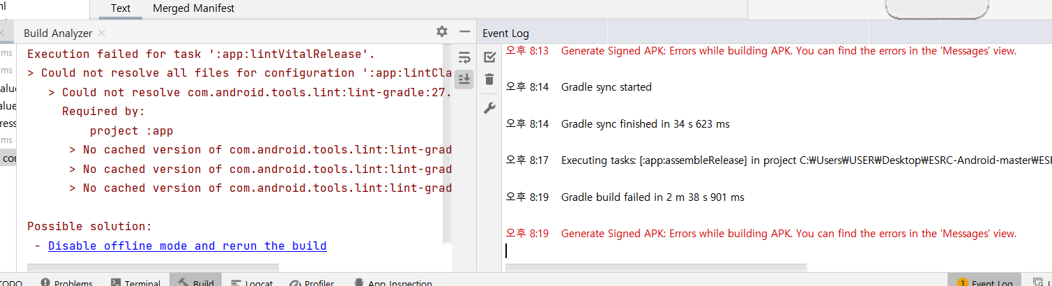 Execution failed for task ':app:lintVitalRelease'. 이걸로 검색해야 해결할 방법을 찾을 수 있습니다.