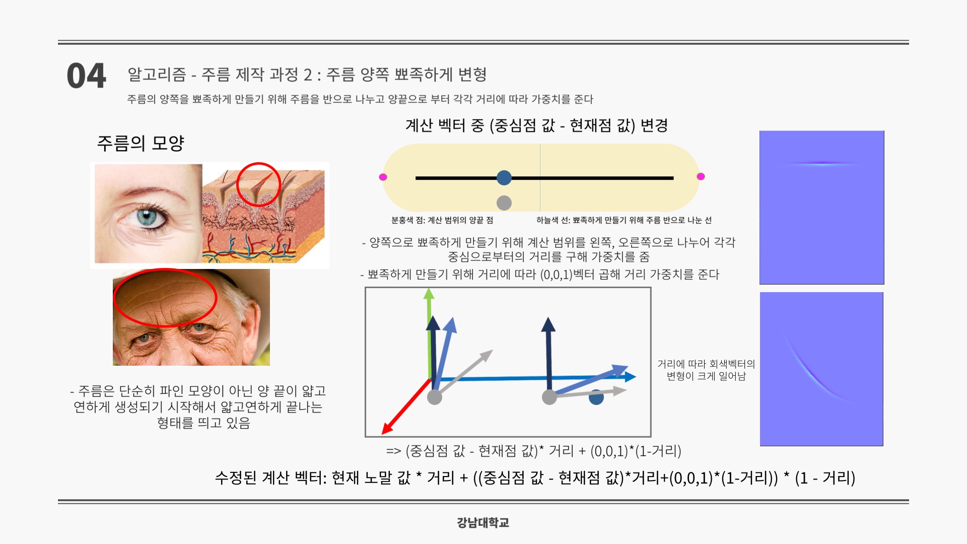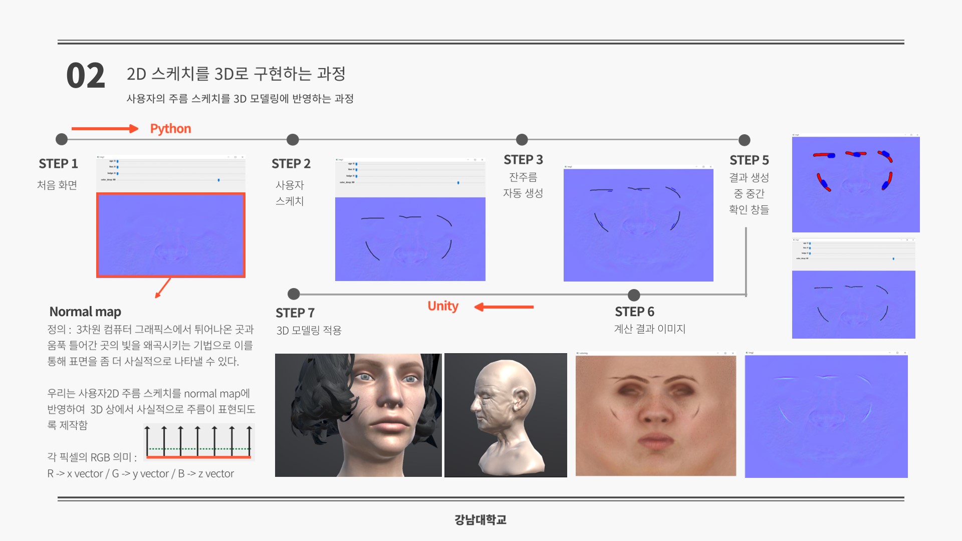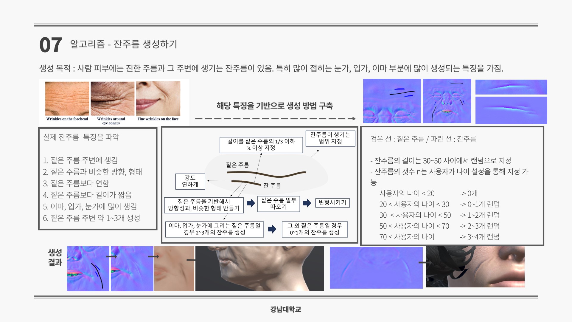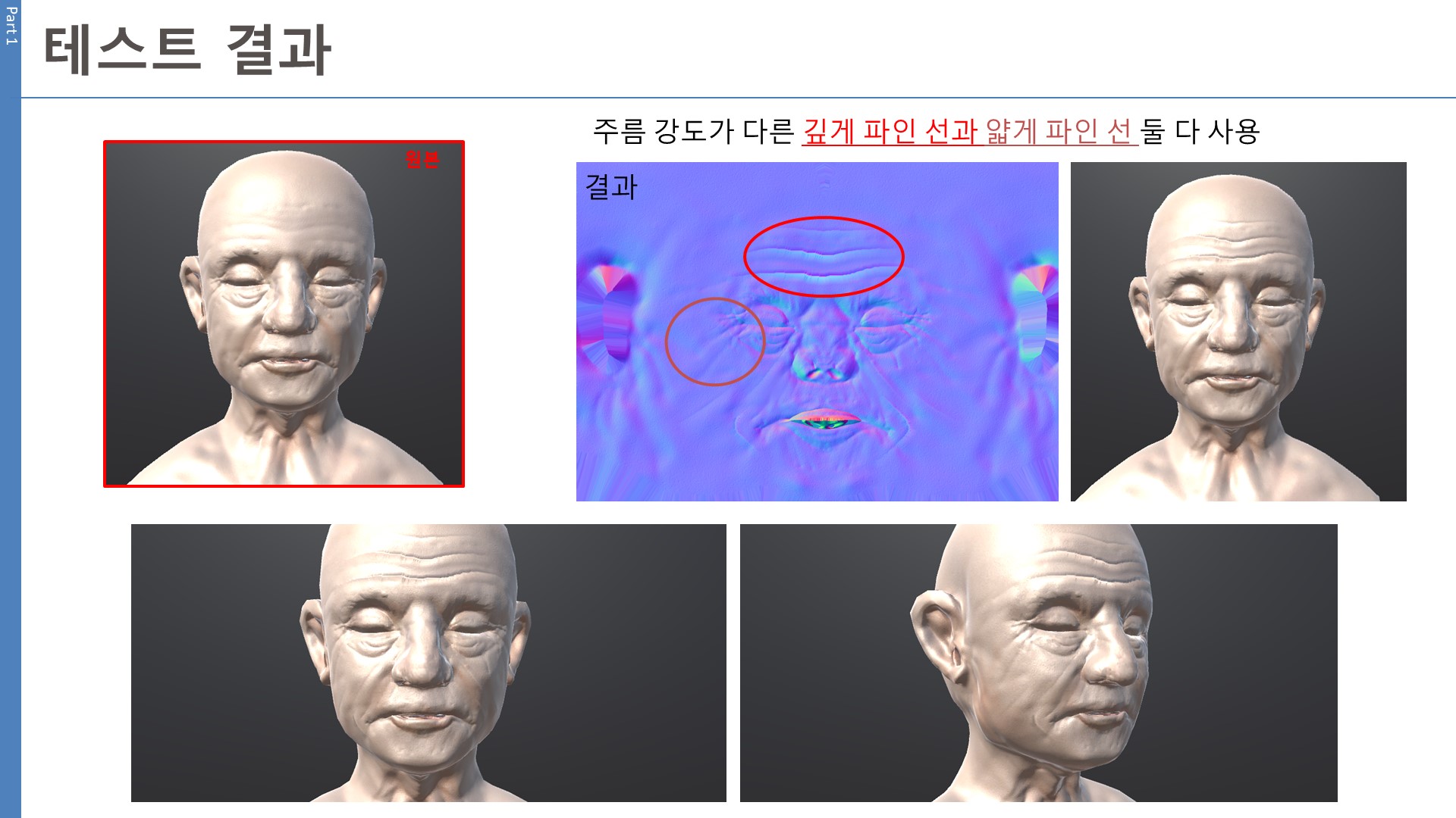 학교 졸업식로 진행한 프로젝트입니다. 해당 프로젝트는 디자이너가 아닌 일반인들도 3D 모델링에 주름을 추가할 수 있는 서비스 인터페이스입니다. 사용자가 얼굴 위에 큰 주름을 그리며 사용자가 설정한 나이에 따라 잔주름들이 자동으로 생성되며 자연스러운 모양으로 바꿔서 normal map 을 만들어줍니다.