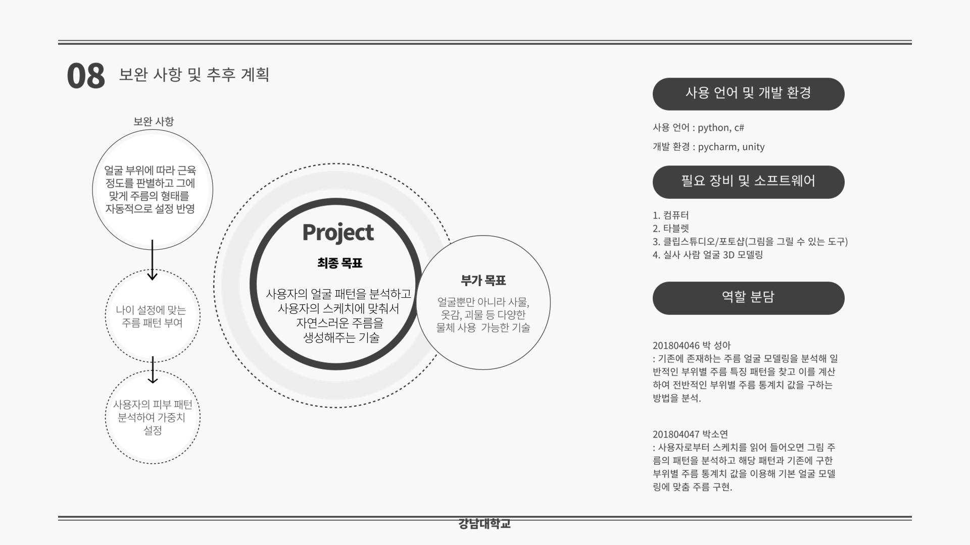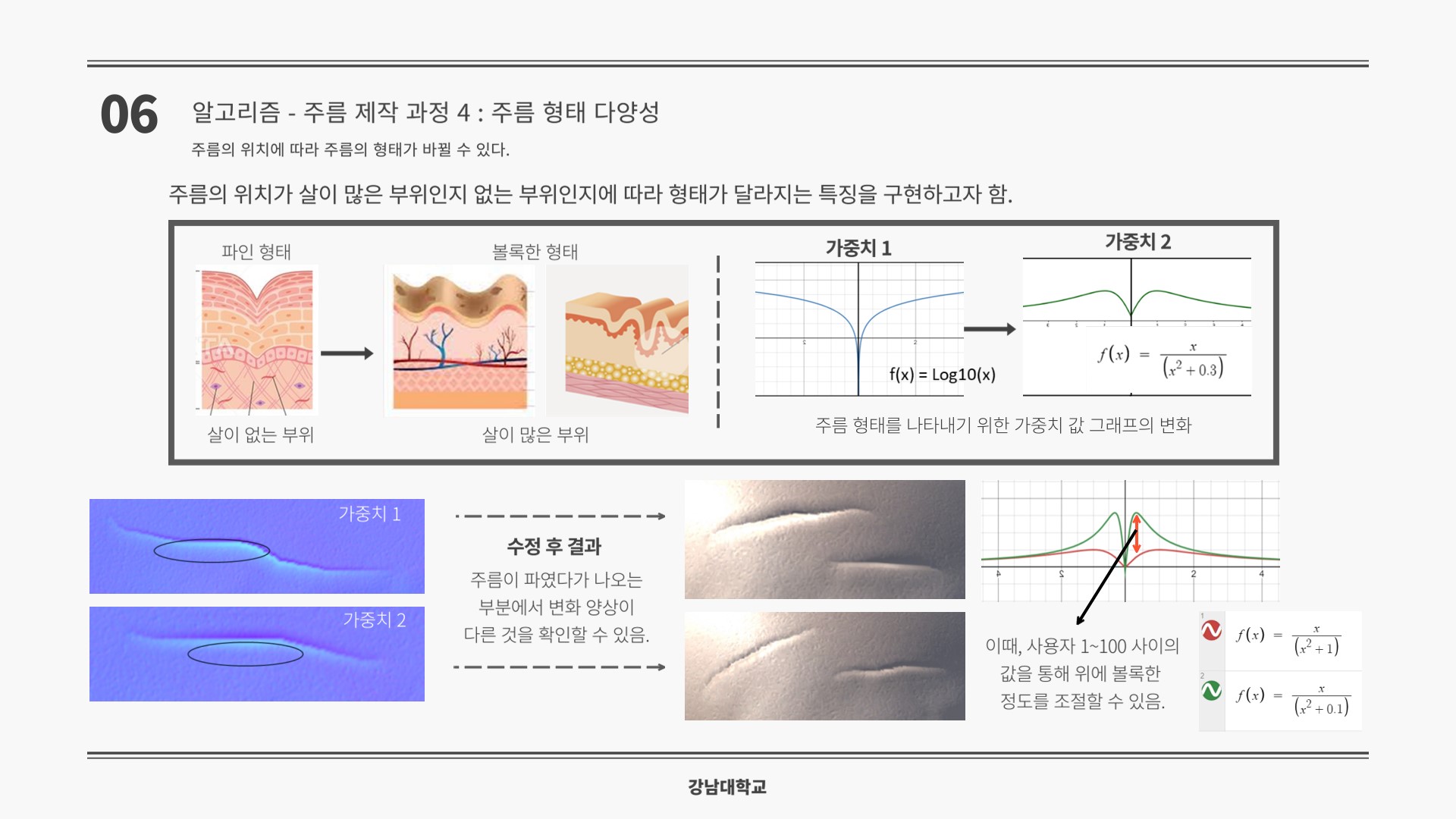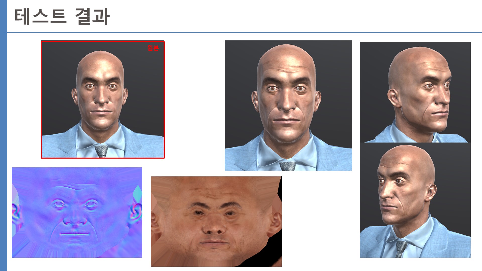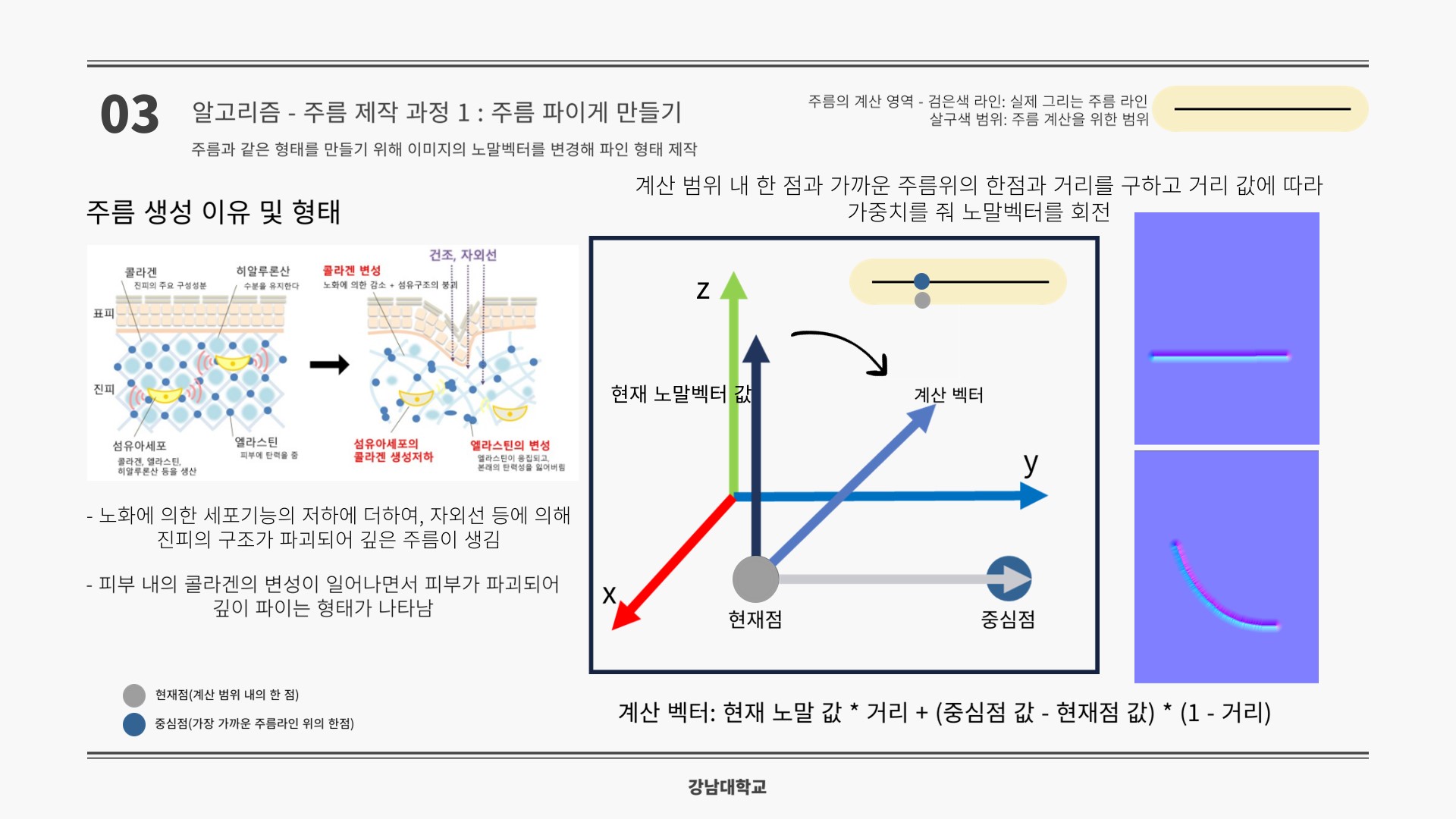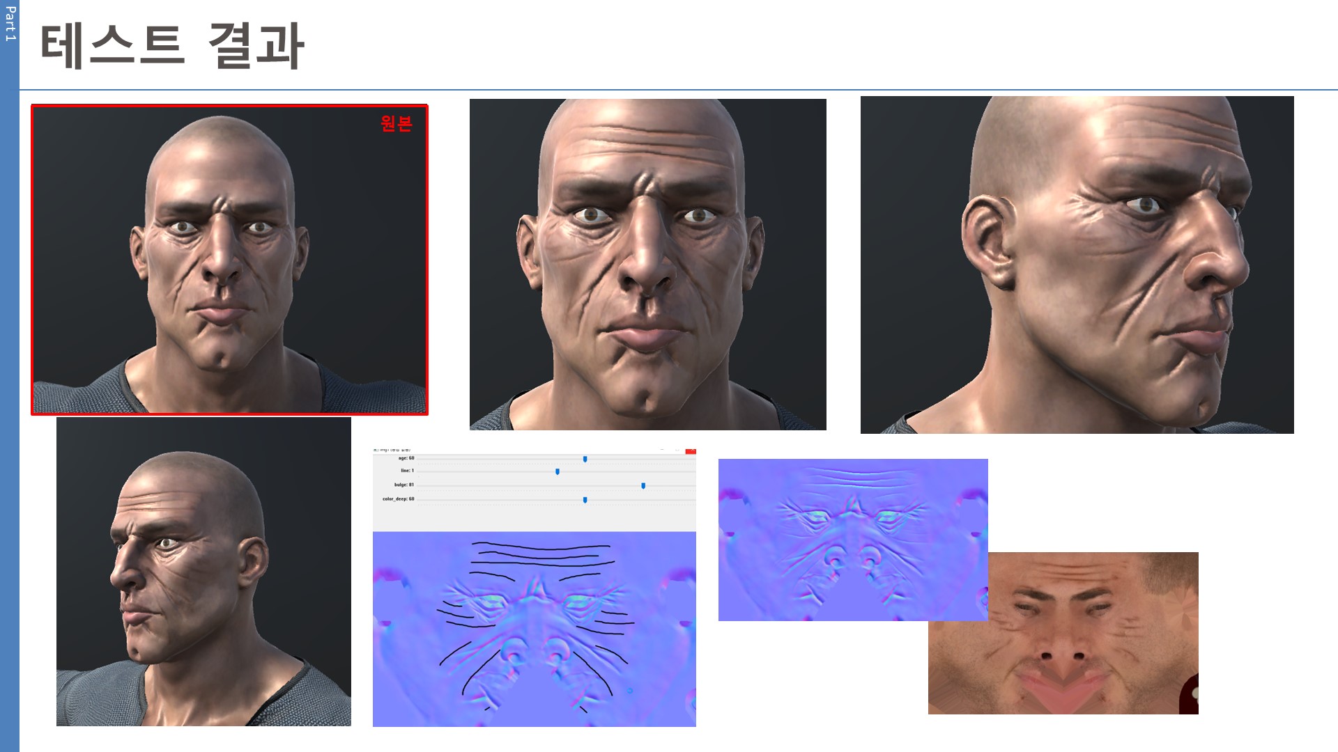 학교 졸업식로 진행한 프로젝트입니다. 해당 프로젝트는 디자이너가 아닌 일반인들도 3D 모델링에 주름을 추가할 수 있는 서비스 인터페이스입니다. 사용자가 얼굴 위에 큰 주름을 그리며 사용자가 설정한 나이에 따라 잔주름들이 자동으로 생성되며 자연스러운 모양으로 바꿔서 normal map 을 만들어줍니다.