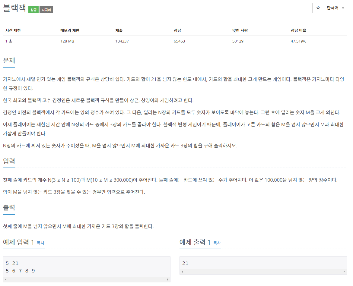 카드 세장을 뽑아서 최대한 M에 가까운 숫자를 만드는 것이 관건이다. 처음에 생각한 방법은 일일이 다 검사해서 확인해주는 방법이다. 삼중 반복문을 이용했고 큰 값을 넣어주었다. (모든 경우의 수를 다 확인해야하는 완전 탐색 문제이다.)