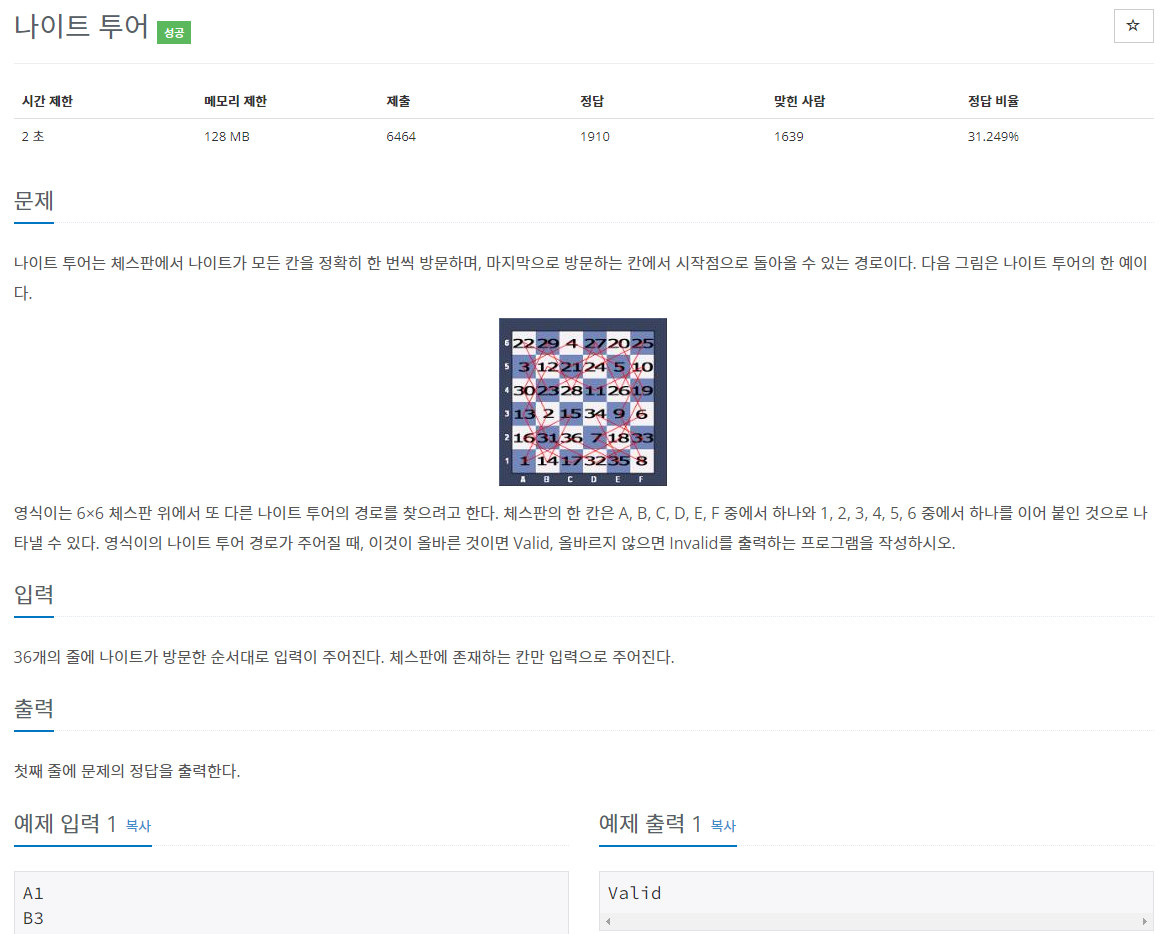 2. chass_map 이라는 이차원 배열 만들어서 지나갈때마다 +1 해서 검사해주었다. 만약에 0 이거나 2 이상이면 안 지나가거나 여러번 지나갔기 때문에 Invalid 가 된다.