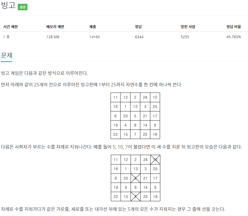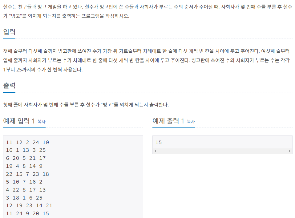 몇번째 빙고가 되는지 출력해주는 문제로 빙고판과 사회자가 부르는 숫자가 주어진다. 처음에는 어렵다고 생각했다. 어떻게 빙고가 되었는지 확인해주지 BFS 써야하나 싶었는데 이건 빙고판 사이즈가 정해지지 않을 때 이야기고 해당 문제는 빙고판 사이즈가 정해져있기 때문에 5X5 빙고판 생각해서 상수로 검사해주면 싶게 풀린다.