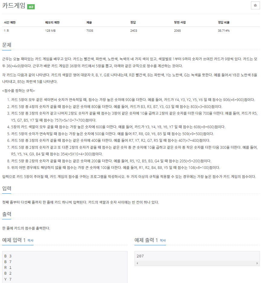 사실 보자마자 건너뛰고 싶었으나.... 순차적으로 풀어야 의미가 있기에 눈물 머금고 했다. 해당 문제는 복잡하게 짜면 코드 줄이 엄청나게 늘어날 가능성이 있기 때문에 최대한 딕셔너리, 리스트, 함수, 인덱스 등 활용해서 풀었다. 숫자를 표시해주는 딕셔너리 / 각 n 번째 숫자에 카드의 갯수를 확인해주는 리스트 하나, 그냥 숫자 담긴 리스트 하나를 만들어서 풀어주었다.