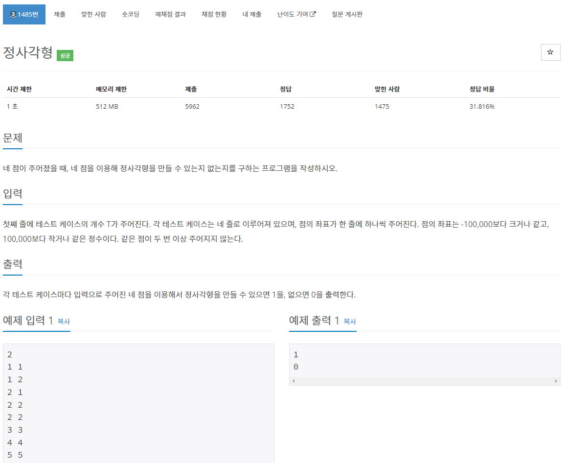 4개의 점이 들어왔을 때, 사각형인지 아닌지 구하는 문제로 사각형의 조건에 대해 잘 생각해봐야했다. 이 점들이 순서대로 들어오는 것도 아니니 어떻게 할까 고민했는데 본인이 사각형의 조건을 "점과 점 사이 거리가 대각선 거리, 변의 거리 2가지 값 밖에 없음" 으로 정의했다. 만약에 이 두가지 값 외 제 3자 다른 거리 값이 나온다면 즉 사각형 아님으로 판별하는 것이다.