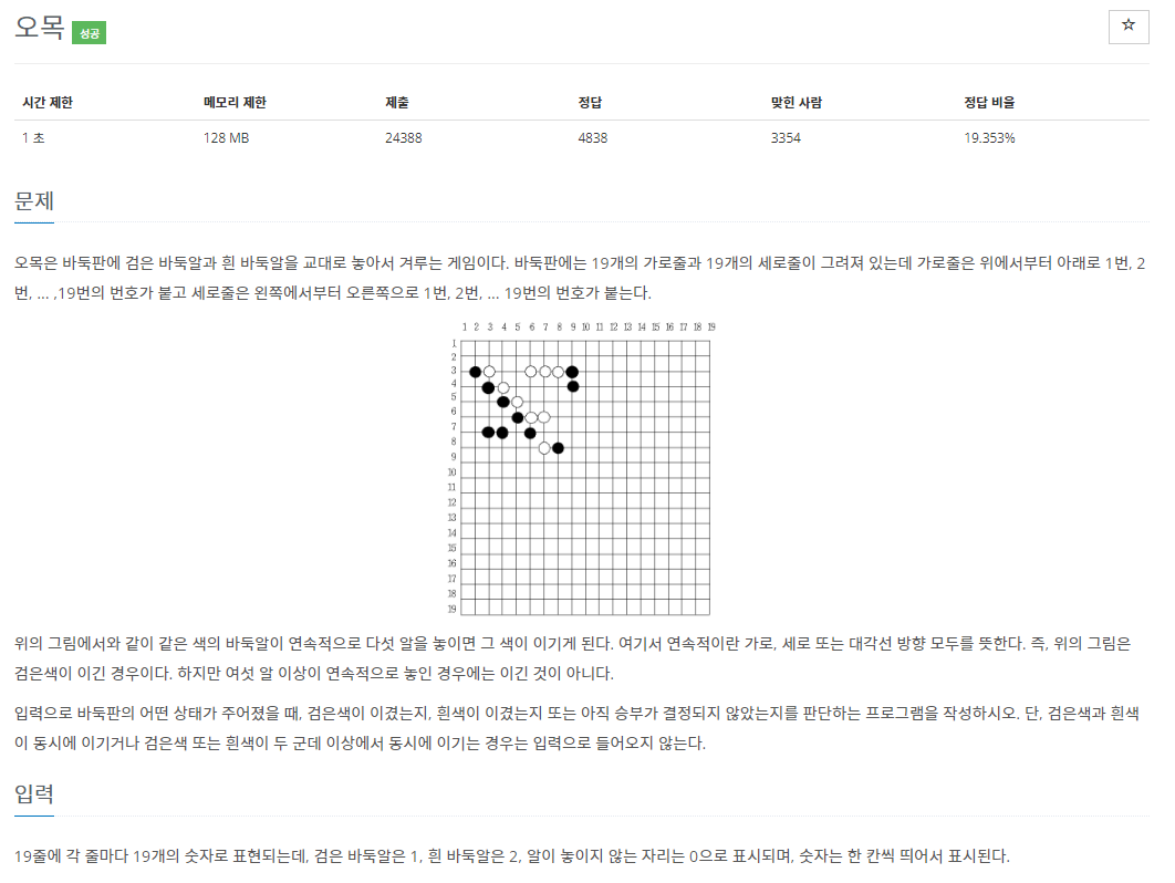 바둑판이 주어졌을 때 흑돌이 이겼는지 백돌이 이겼는지 아직 결판이 안 났는지를 출력하고 이긴 자가 있다면 제일 왼쪽 상단 돌의 위치를 출력하는 문제이다. 푸는 데 고려한 점은 어떻게 검사해줄까 였고 주의할 점은 딱 5개만 이기고 5개 미만이거나 6개 이상 이어질 경우 이겼다고 판단하지 않는다는 점이다.