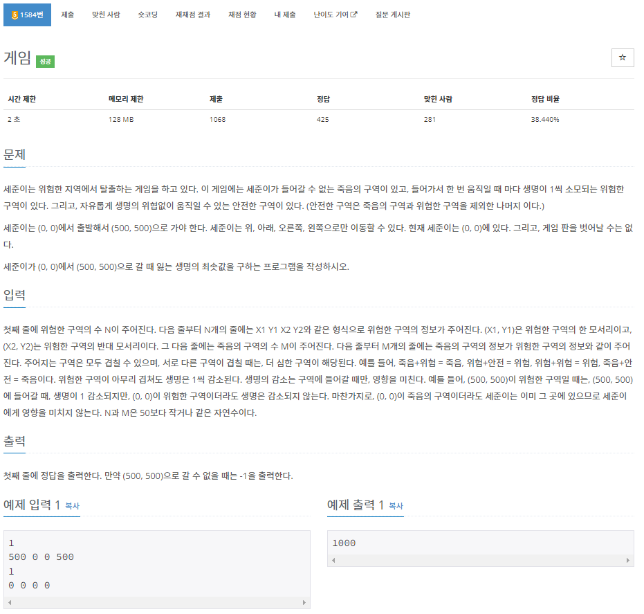 세준이가 0,0 에서 500, 500 으로 이동할 때 잃는 생명의 최솟 값을 구하는 문제로 BFS를 적용해서 풀었습니다. 풀면서 고려해야하는 점은 사방면 이동, 위험과 죽음 영역이 겹쳤을 때 처리 방법, 최솟값을 구해야한다는 점입니다.