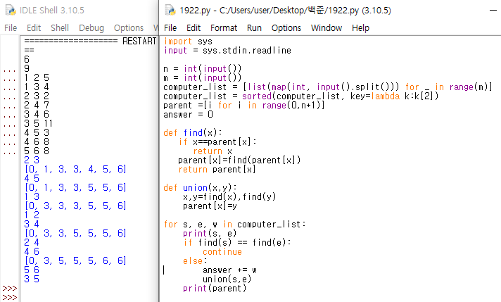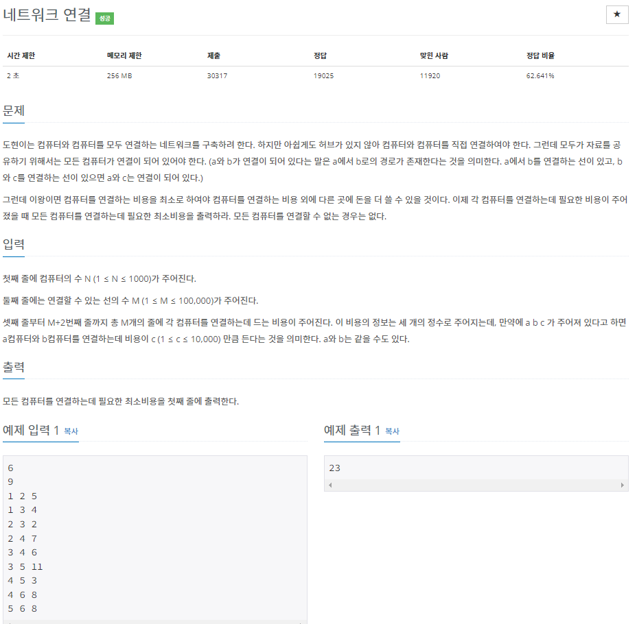 모든 컴퓨터가 연결했을 때 최소 비용을 구하는 문제로 처음 문제를 보고 생각한 풀이 방법은 가중치가 적은 순으로 나열해연결할까 생각했는데 그 경우 어떻게 모든 컴퓨터가 연결되었는지 확인 방법이 생각 안났습니다. 그래서 두번째는 한 점을 잡아서 작은 가중치로 타고 타고 연결할까 했지만 그 경우 최소값을 구할 수 없다는 점이 있었습니다.