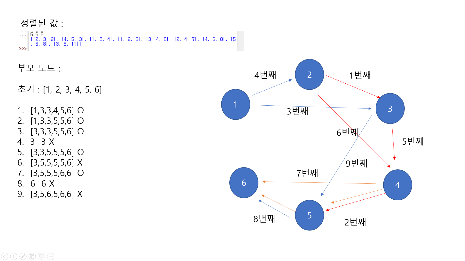 피피티로 값을 정리하면서 이해하였는데 위의 정렬된 값이 순차적으로 들어온다고 할 때 부모 노드 배열이 어떻게 바뀌는지 적어놓았습니다. 여기서 주의할 점은 O 경우 둘의 부모가 다르다고 판별해서 union 함수를 통해서 연결해주는 경우이고 X 경우는 둘의 부모가 같다고 판별해서 연결을 안해준 경우입니다. 이때, 연결을 안해주어도 find 함수에서도 부모 노드 배열 값이 바뀐다는 것입니다.
