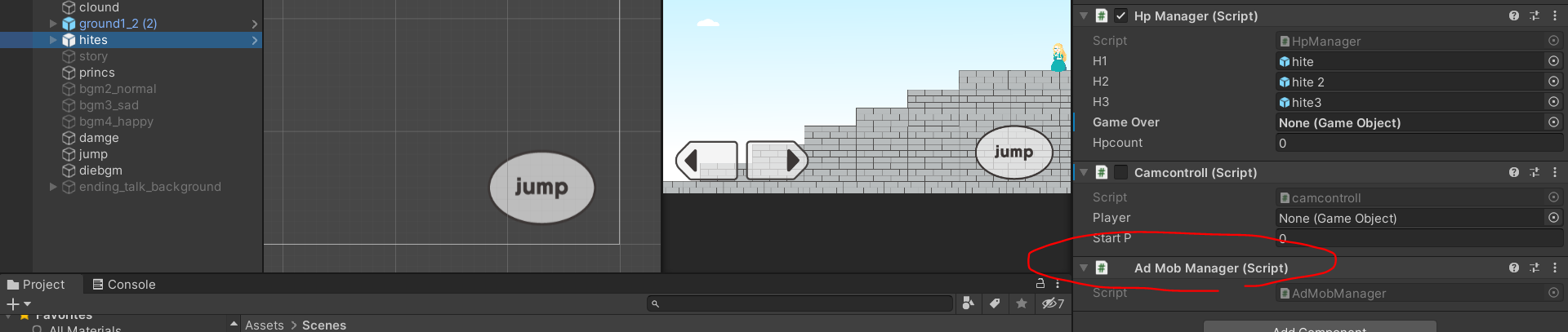 참고로 위 스크립트는 아래 광고 띄우고 위해 코드 추가한 스크립트가 작동하는 Scene의 Hierachy 에 추가 되어있어야 합니다. ((아마 위치는 딱히 상관없는 듯 합니다))