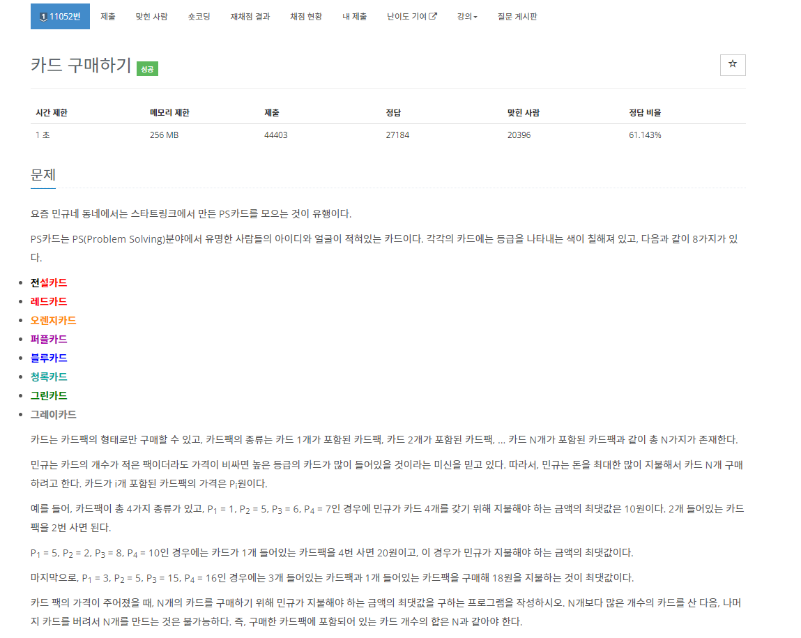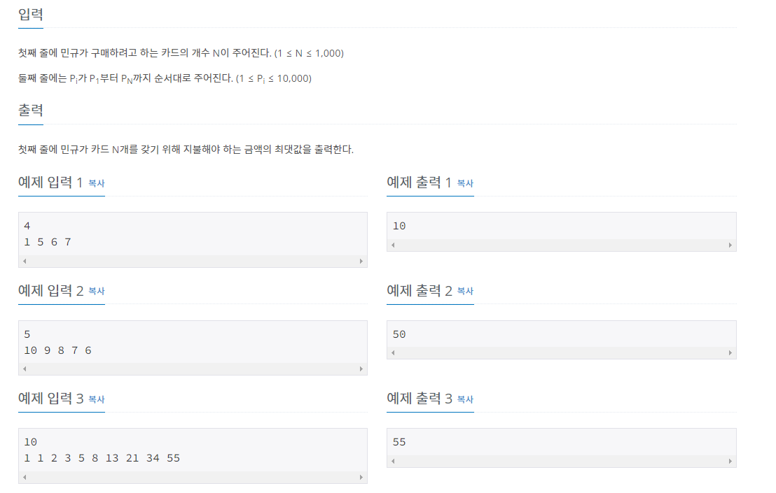 해당 문제는 카드 팩의 가격이 주어졌을 때, N개의 카드를 구매하기 위해 민규가 지불해야 하는 금액의 최댓값을 구하는 프로그램으로 DP에 어떤 값을 누적시킬 건지 중요한 문제인 것 같습니다.