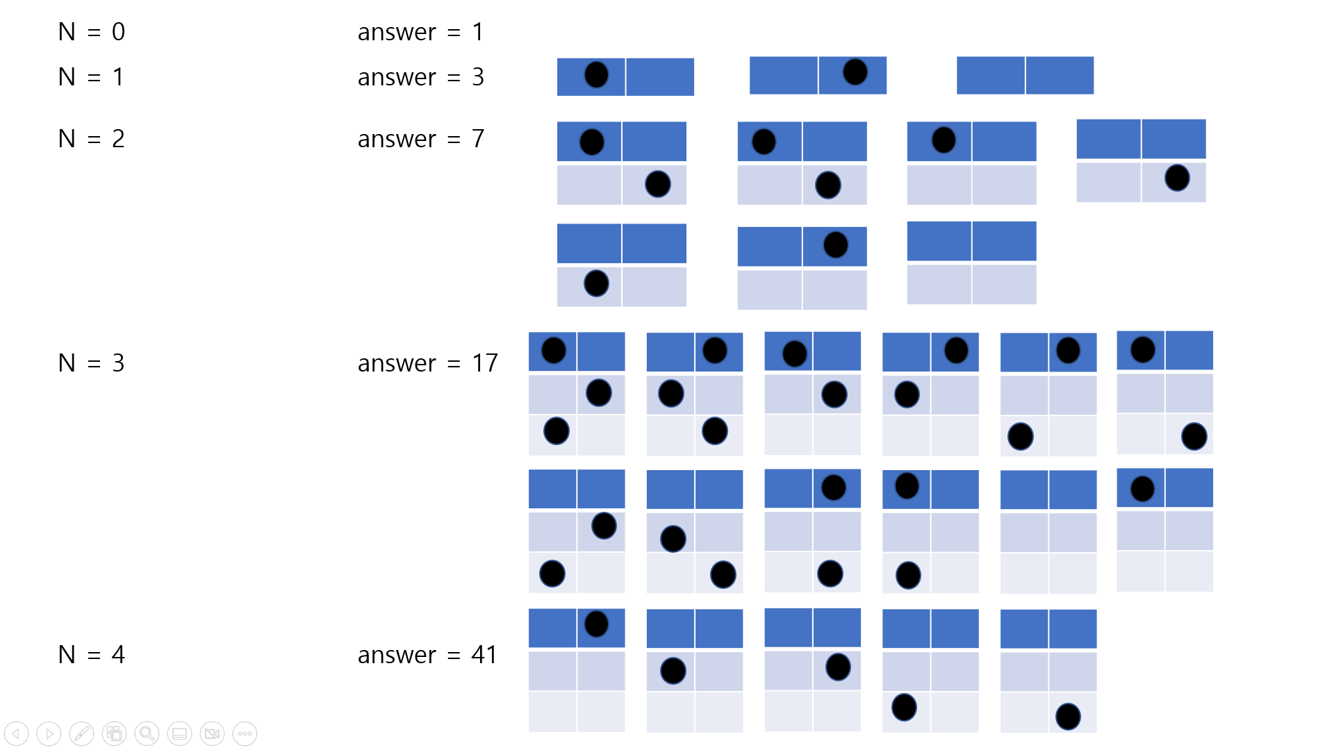 처음에 N =3 의 답을 잘못 세어서 18로 알고 한동안 규칙을 못 찾고 헤맸는 거 같습니다. 규칙성을 찾아서 푸는 문제인만큼 각 경우에 따른 답을 잘 찾는 것도 매우 중요한 거 같습니다.