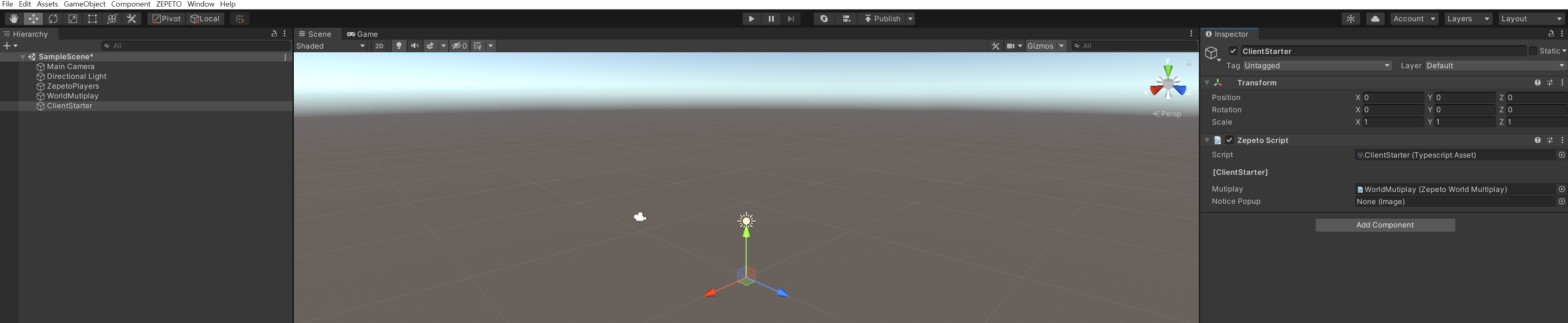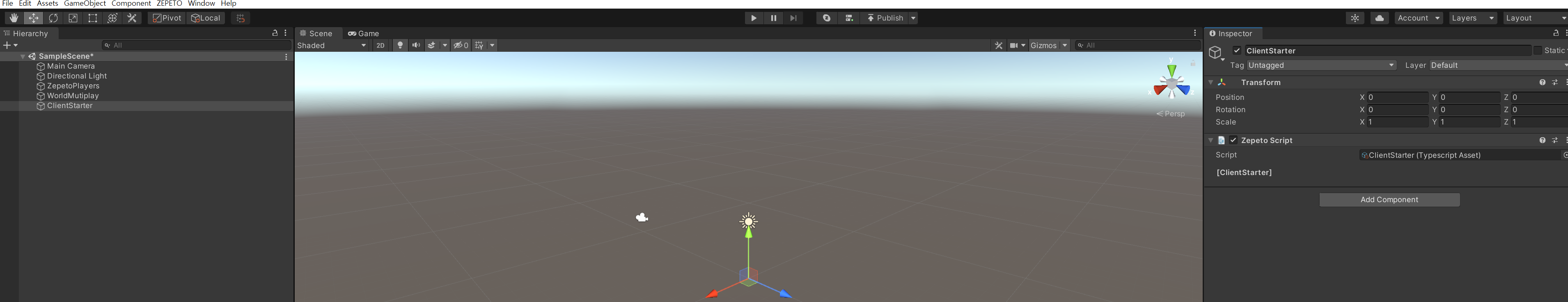 6. ClientStarter 오브젝트에 ClientStarter.ts 스크립트 추가