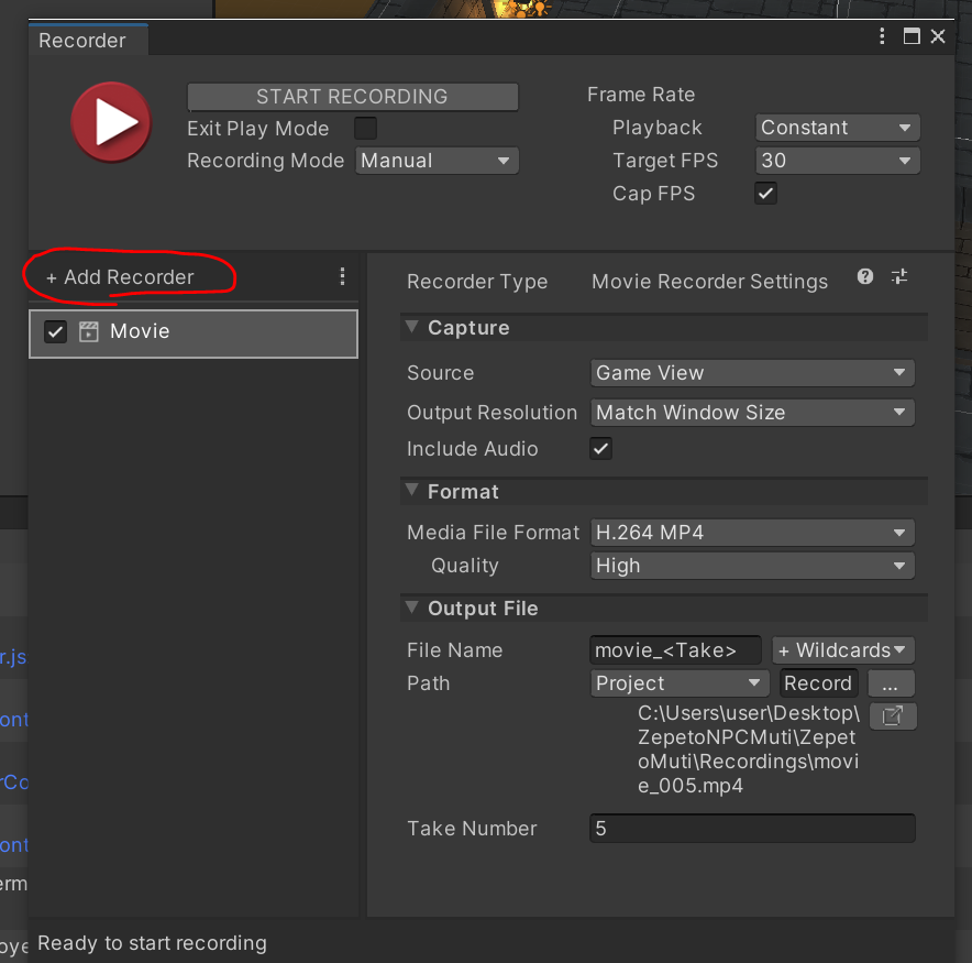 그럼 위에와 같은 창이 뜨는데 여기서 Add Recorder 버튼을 누르고 타입으로 Movie 로 추가해주세요. 그리고 유니티에서 게임 시작 하기 버튼 누르고 난 후 위의 창의 Start Recording 버튼 눌려서 녹화 시작할 수 있으면 끝내고 싶으면 Stop Recording 버튼 눌려서 끝낼 수 있습니다. 해당 영상 파일은