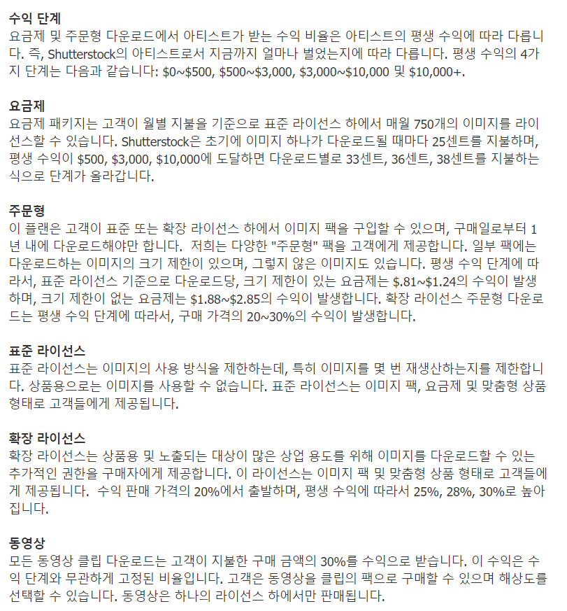 셔터스톡는 등록된 작가들이 사진, 영상, 일러스트 작업물들을 업로드해서 유로 다운로드 수익금이 생기면 일정 기준에 의해 배분받는 형식입니다.