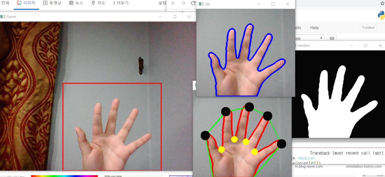 현 문제점 : 손가락을 접어도 손가락으로 인식이 됨. 손의 중심을 구해야함.