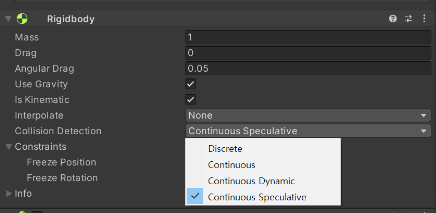 일정 tick 간격으로 충돌 확인, 다른 콜라이더들은 충돌할때 불연속 충돌 감지를 사용합니다. 기본적으로 설정되는 값이나 시간 간격이 크거나 엄청 빨리 움직일때 충돌이 안될 수 있습니다. 이로 인해 성능이 크게 떨어지나 연산은 빠르고 CPU를 가장 적게 사용하는 장점이 있습니다. 다만, 다른 물체를 통과하는 "터널링"으로 알려진 문제가 발생할 수 있습니다.