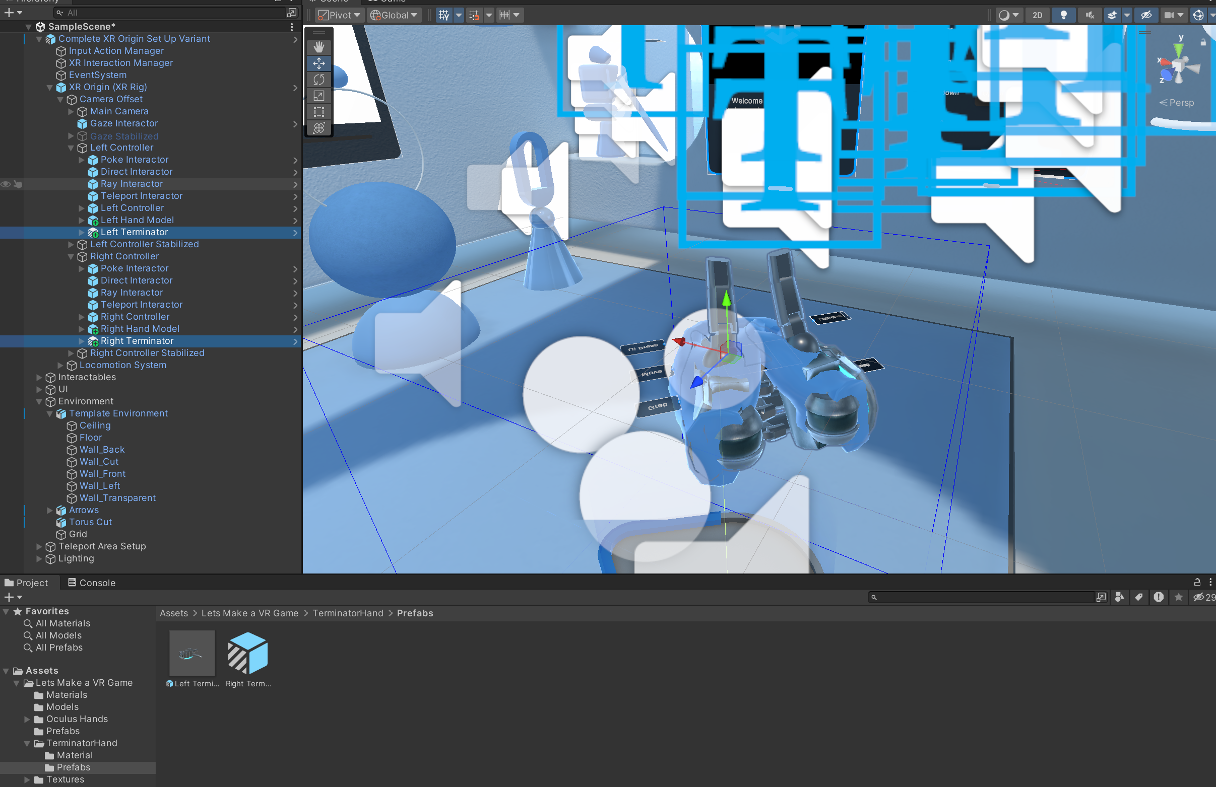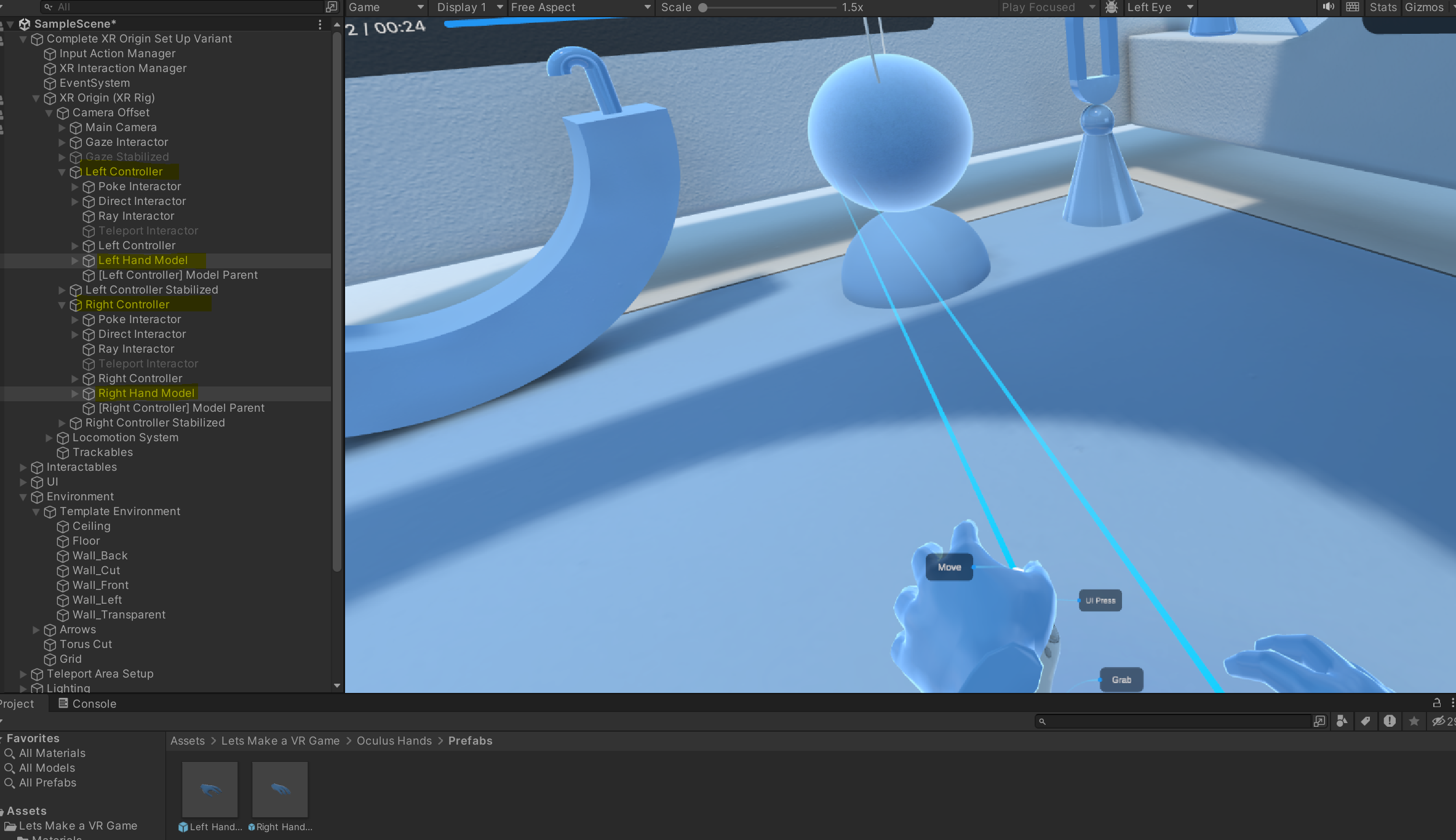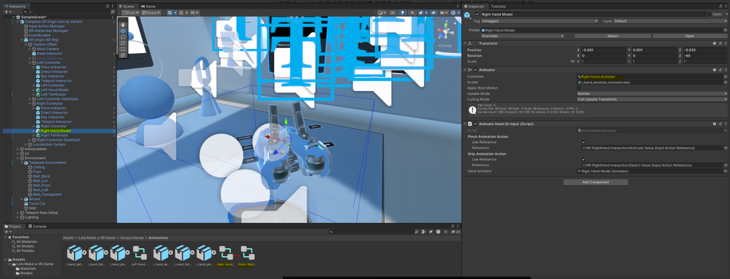그리고 import 해준 후 영상 설명에 따라서 Lets Make a VR Game > Oculus hands > prefabs 안에 있는 오른쪽, 왼쪽 prefab을 left controller, right controller 안에 넣어줍니다.
