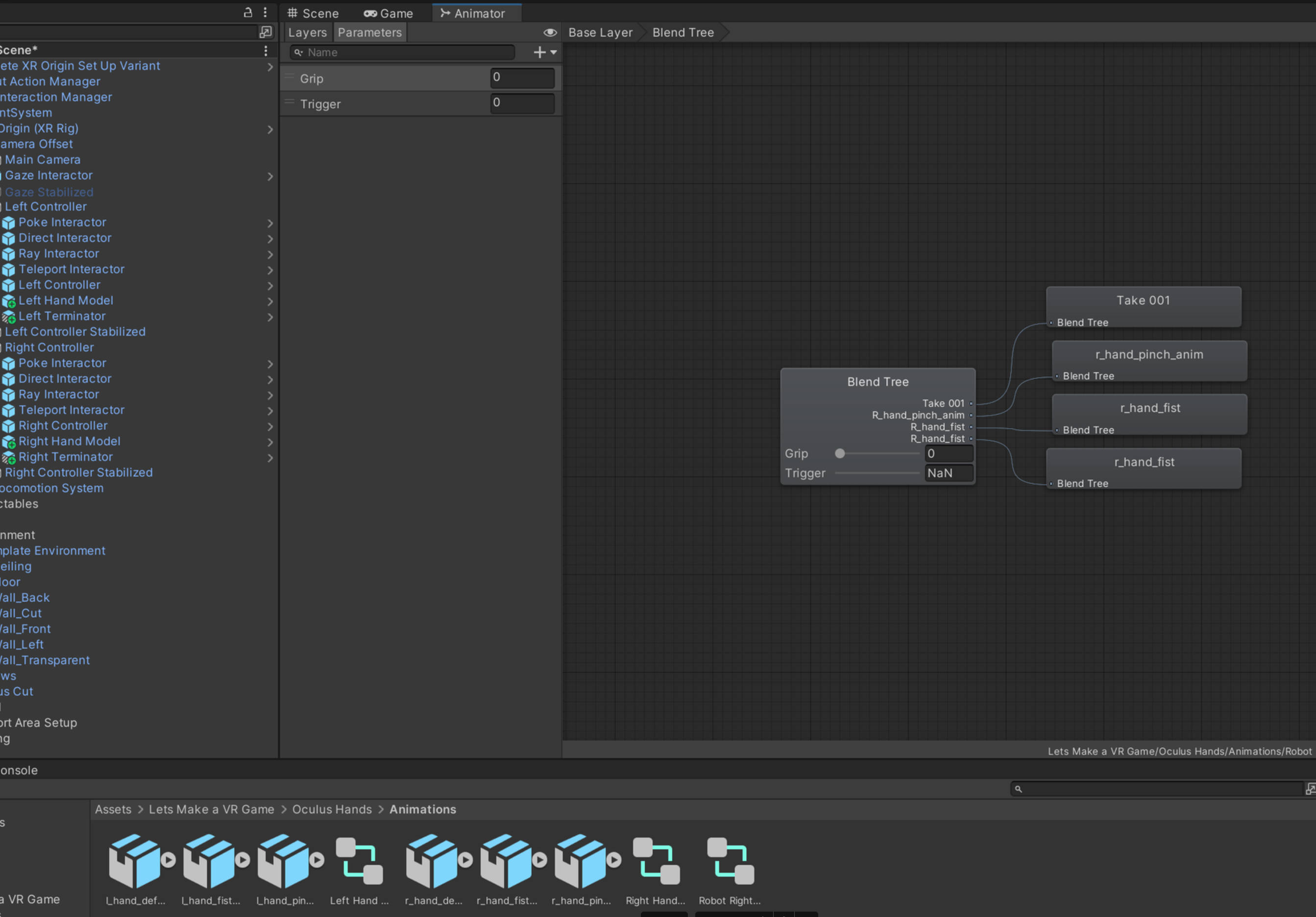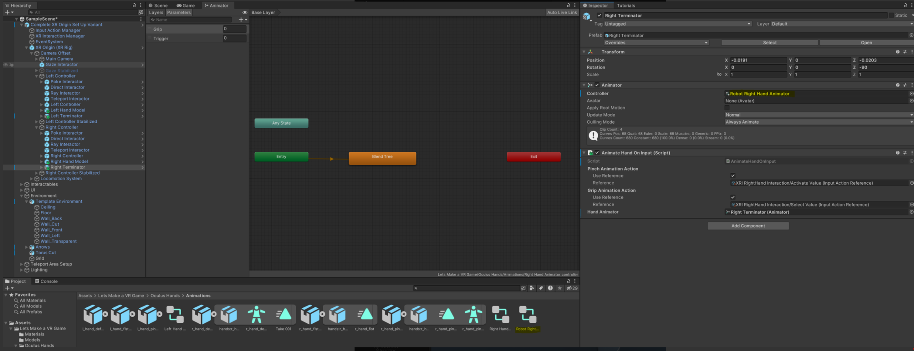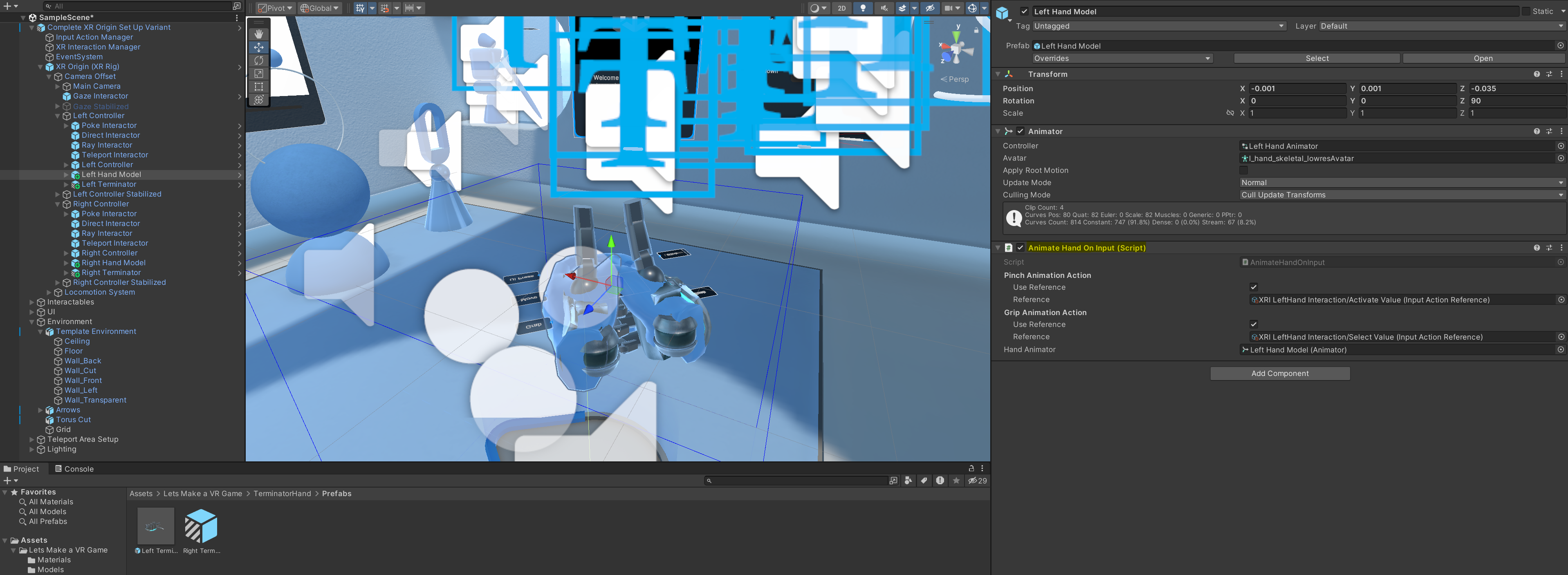 그리고 import 해준 후 영상 설명에 따라서 Lets Make a VR Game > Oculus hands > prefabs 안에 있는 오른쪽, 왼쪽 prefab을 left controller, right controller 안에 넣어줍니다.