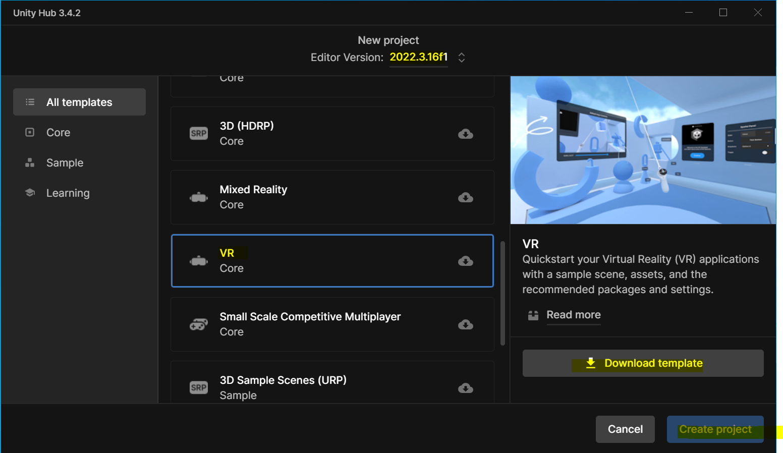 영상에서는 유니티 다른 버전을 사용했지만, 저는 더 최신 버전을 사용했습니다. 먼저 VR 템플릿을 다운로드 받아서 프로젝트를 생성해줍니다.