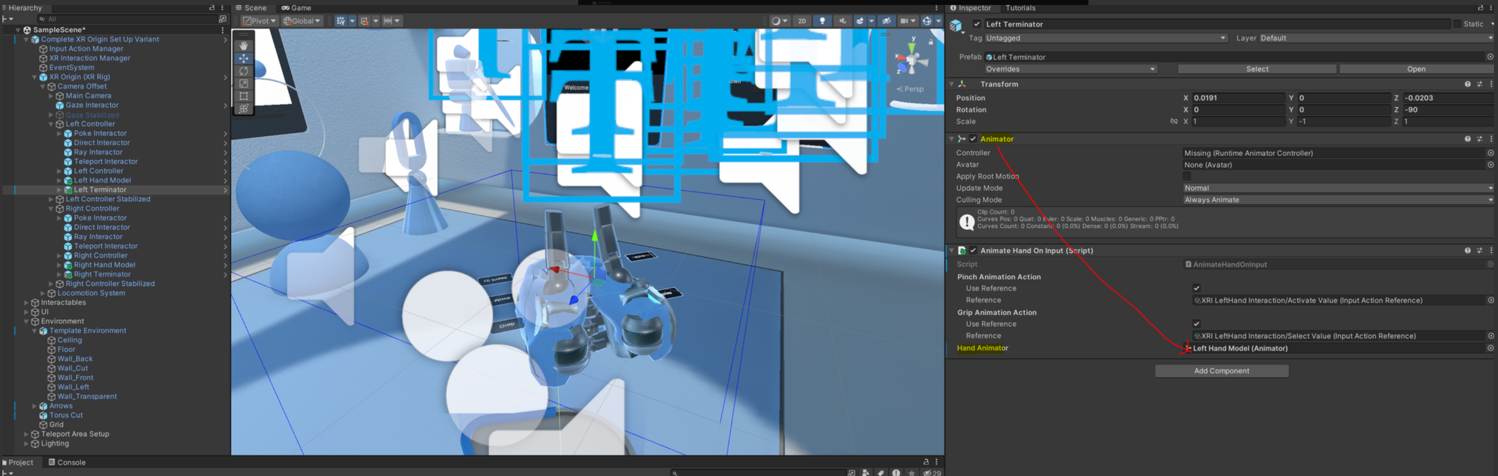 그 다음은 기계 손 모델링 prefab 을 다음과 같이 넣어줍니다.