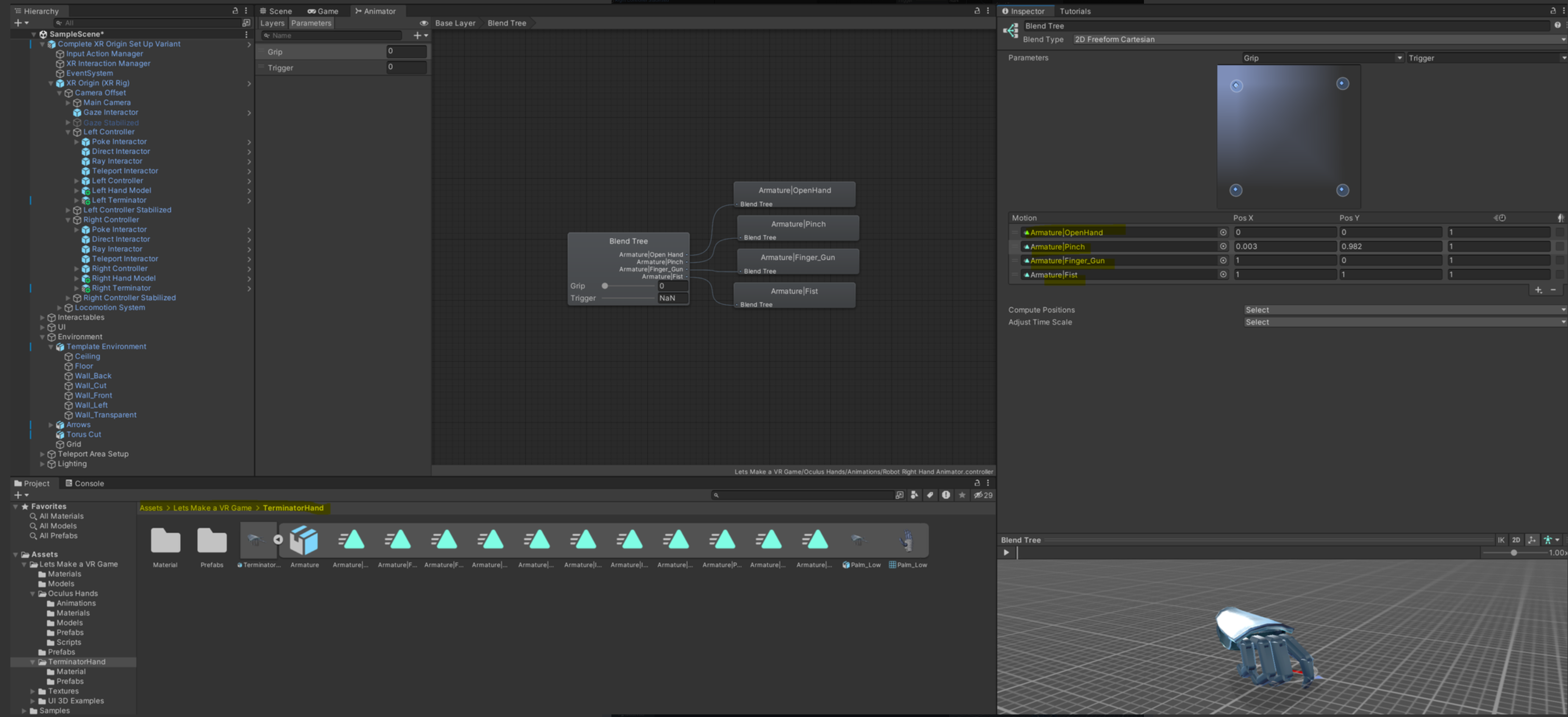 그럼 실행했을 때 정상적으로 기계 손과 손의 움직임에 따른 기계 손 애니메이션 변화를 확인할 수 있습니다.