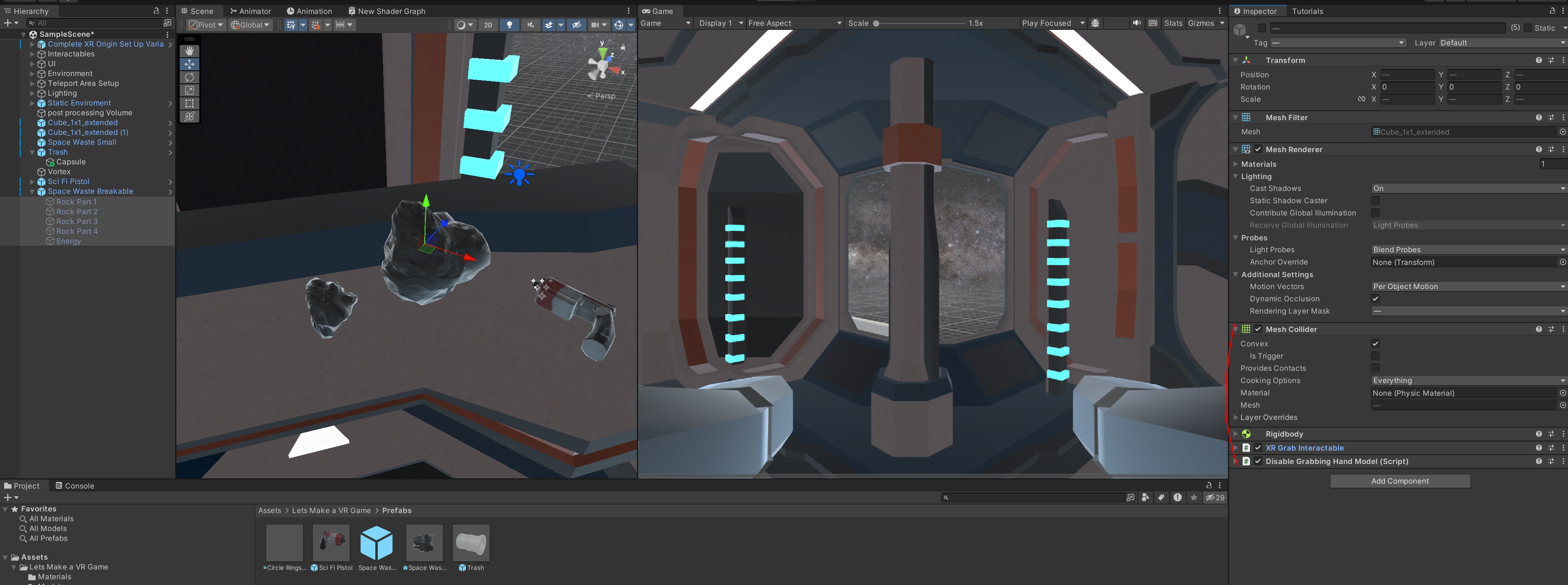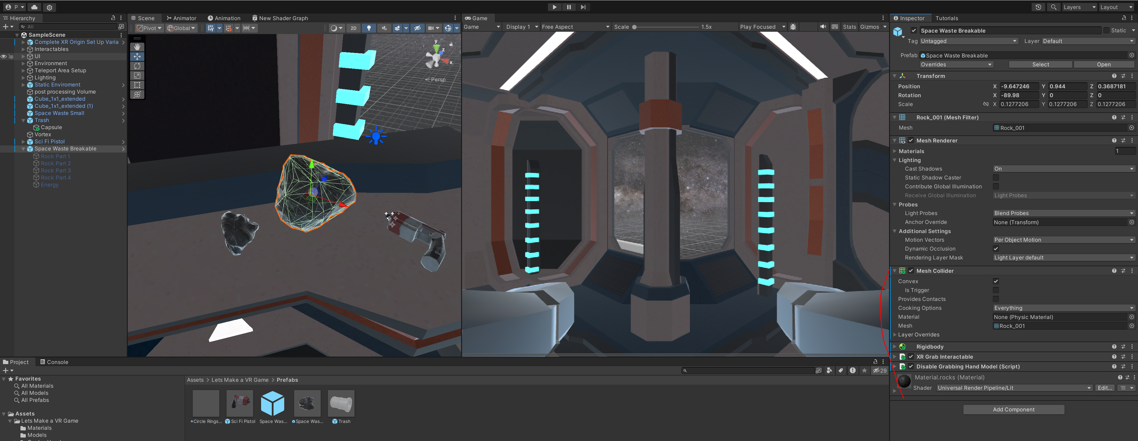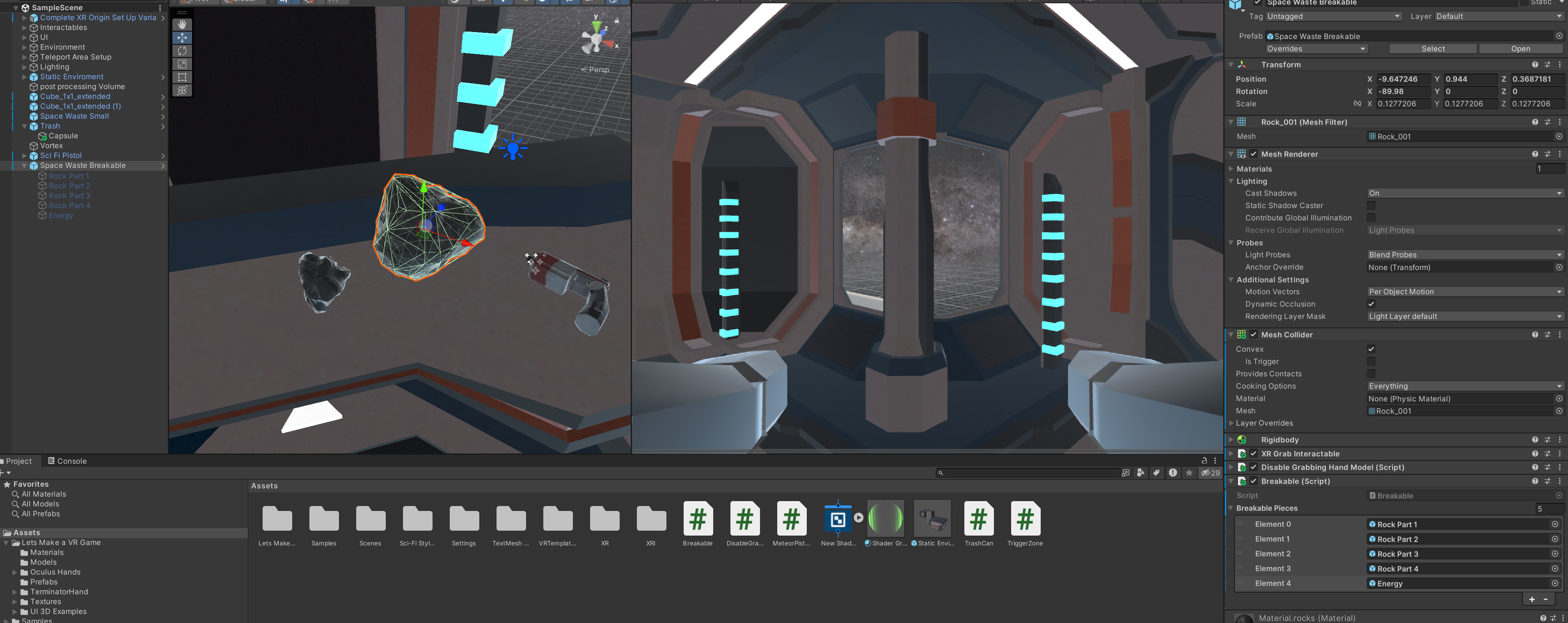 부서지고 나타날 하위 돌 오브젝트에게 아래 컴포넌트처럼 설정해줍니다. 이때 mesh collider -> convex 를 체크해주며 전 글에서 상호작용하는 물체처럼 설정을 해줍니다.