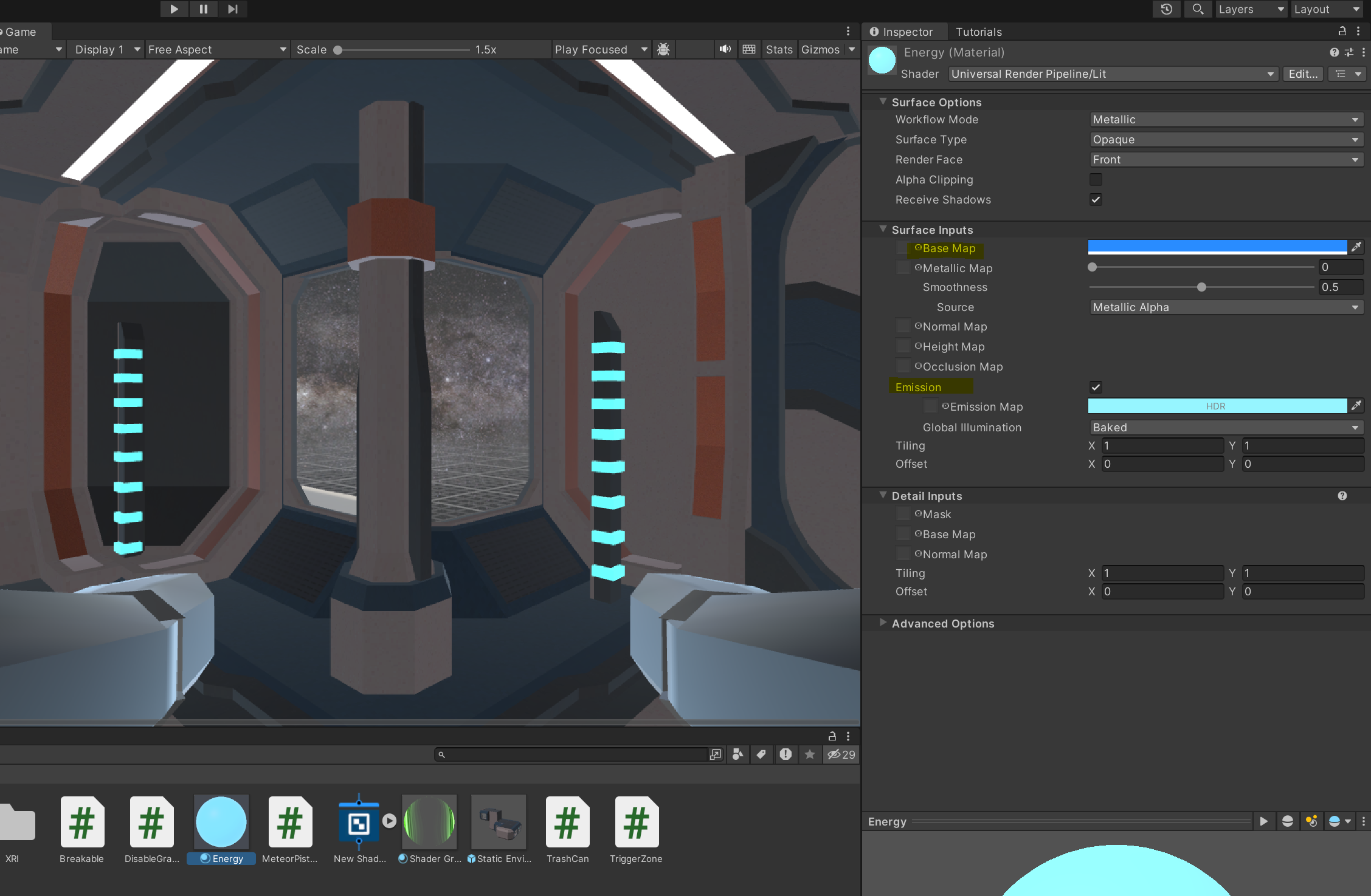 추가적으로 돌이 부서지면서 나타날 Energy material 이 빠져있는데 아래와 같이 material 을 하나 만들어서 넣어줍니다. 여기서 Emission 값은 발광을 이야기합니다.